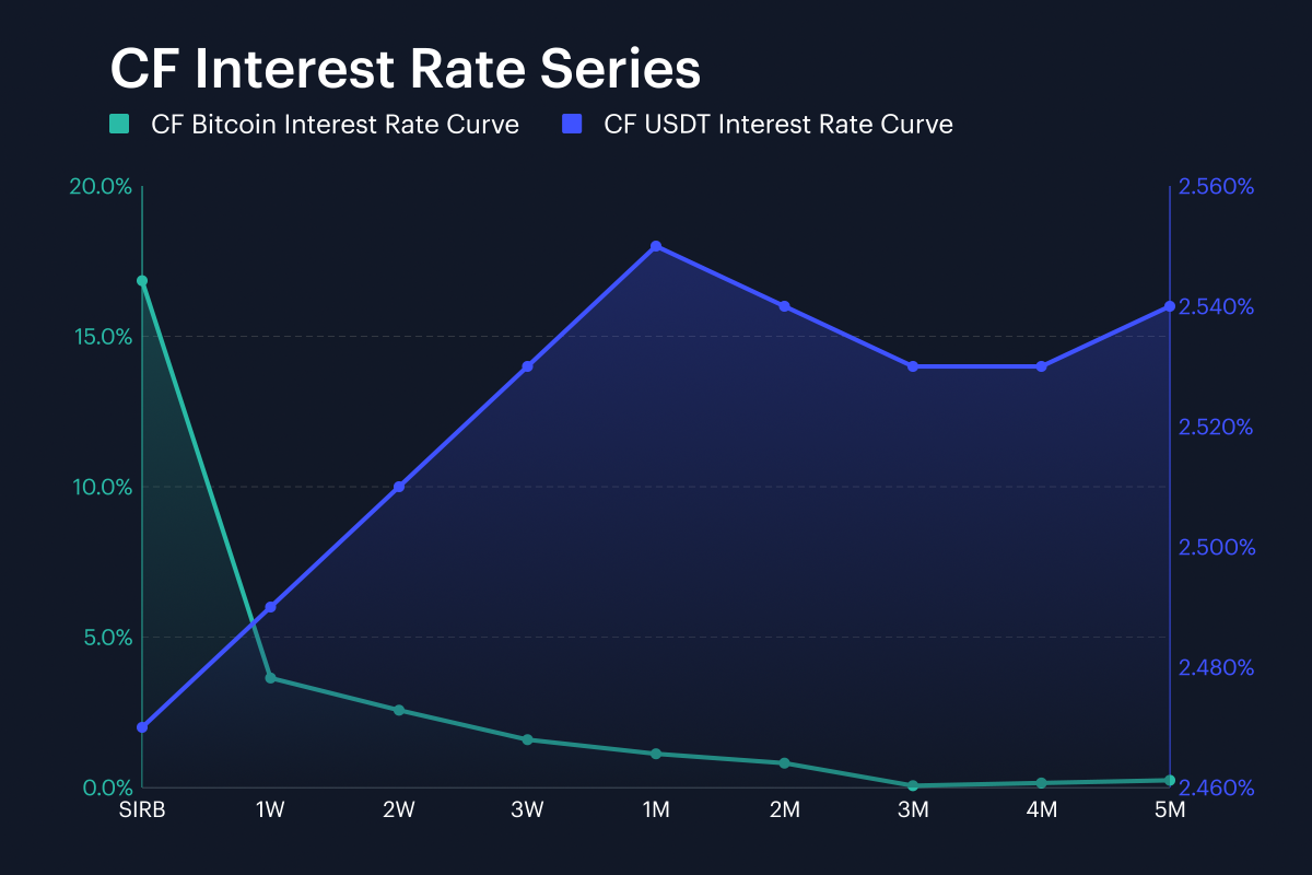 Across our CF BIRC curves, Bitcoin funding conditions displayed further front-end steepening this week, with the session rate surging to new heights while longer tenors remained contained. The Session Interest Rate for Bitcoin (SIRB) jumped from 12.66% at the end of the prior week to 16.85%, an increase of 419 bps that builds on the prior week’s 213 bps rise. The BTC 1W rate edged higher from 3.41% to 3.64%, up 23 bps, a more modest move than the session rate’s leap. BTC 3M fell from 0.10% to 0.06%, down 4 bps, leaving the front-end gap between 1W and 3M at 3.58%, a further widening from last week’s 3.31% spread. BTC 2M rose from 0.55% to 0.81%, up 26 bps, representing one of the few tenors to move higher beyond the very short end. The term structure thus maintained its heavily inverted shape, with the kink between overnight/session rates and the rest of the curve becoming increasingly pronounced. In USDT funding, the session rate was largely unchanged at 2.47% (versus 2.46%), with the 1W rate at 2.49% and 3M at 2.53%, implying continued flatness. The widening gap between BTC and USDT session rates, now over 14%, is the most extreme reading in recent weeks and suggests that leveraged BTC-specific demand for short-dated funding continues to intensify even as spot markets have stabilized.