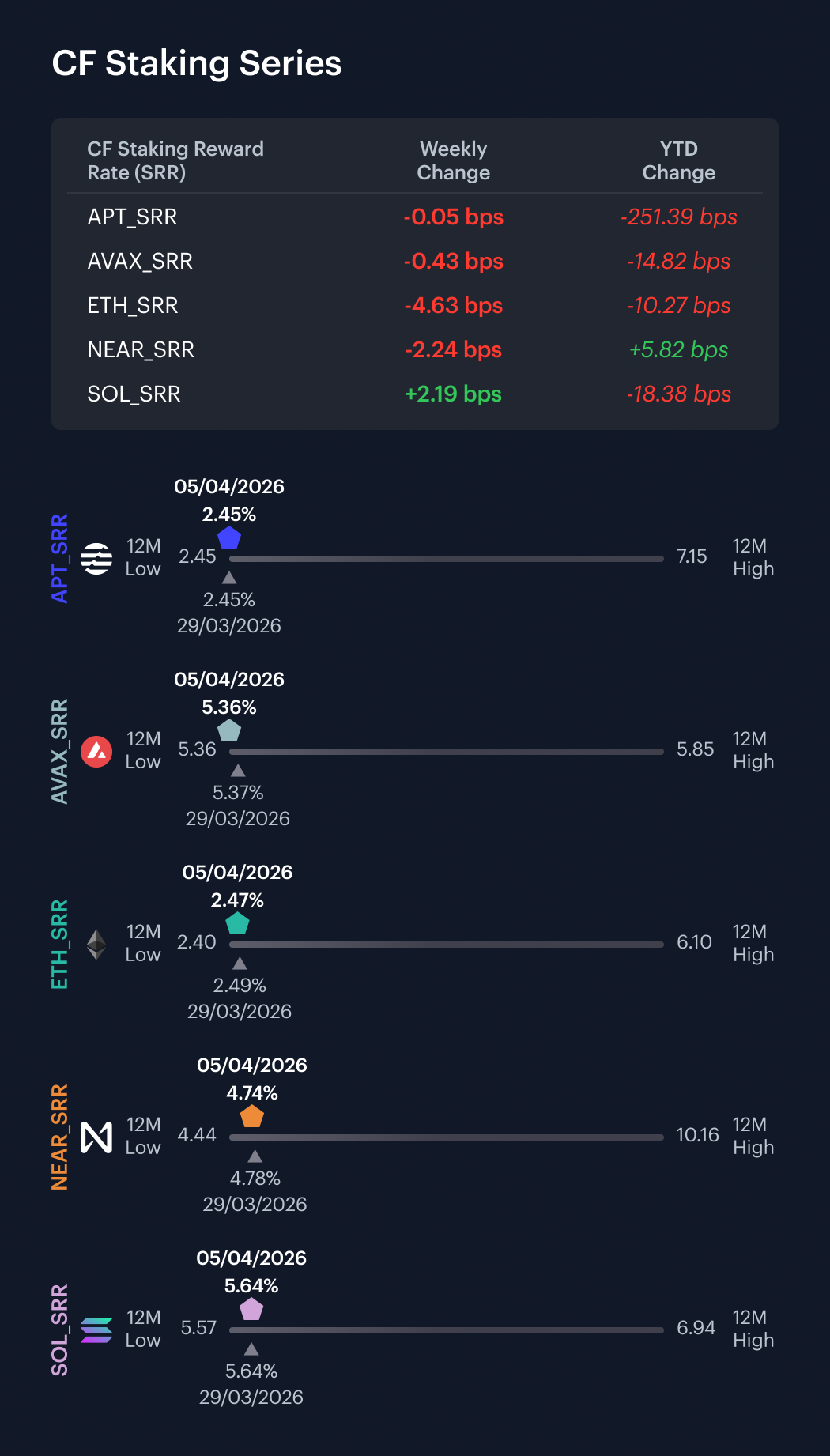 Within the CF Staking Series, conditions remained subdued for a second consecutive week following the prior period’s APT-driven dislocation. APT Staking was essentially flat at -0.02% w/w, with its reward rate decreasing by 0.05 bps to 2.45%, consistent with the stabilization observed after last week’s post-reset normalization. AVAX Staking posted -0.08% w/w, with a decrease of 0.43 bps in its reward rate. ETH Staking returned -1.84% on the week, a significant moderation from last week’s -19.14%, with its reward rate decreasing 4.63 bps from 2.51% to 2.47%. NEAR Staking returned -0.47% w/w, reversing last week’s increase, with its reward rate decreasing 2.24 bps. SOL Staking was the only name to post an increase at +0.39% w/w, with its reward rate increasing 2.19 bps to 5.64%. Across the complex, reward rate movements ranged from -4.63 bps (ETH) to +2.19 bps (SOL), a tighter band than the prior week, consistent with a normalization in yield conditions.