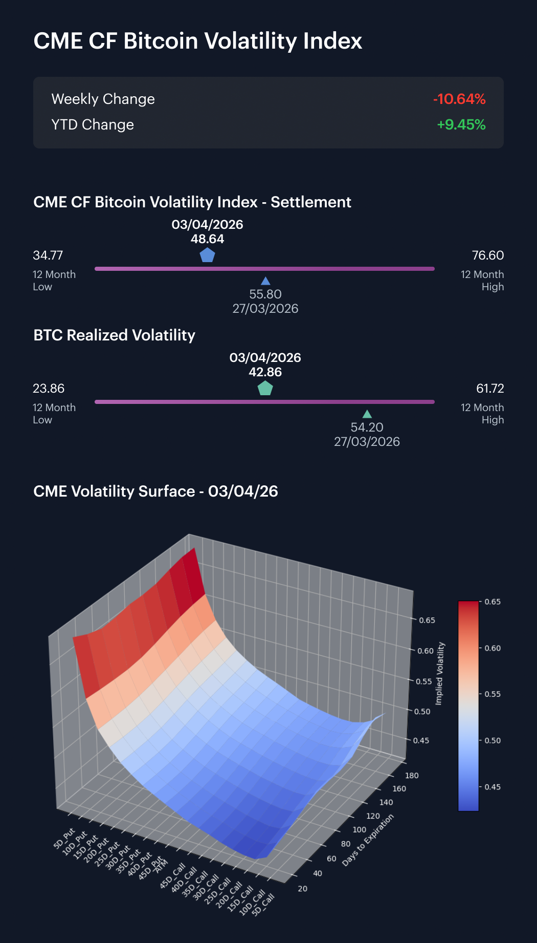 Bitcoin volatility declined sharply in both implied and realized terms, marking a clear break from the elevated regime of recent weeks. The CME CF Bitcoin Volatility Index Settlement Rate (BVXS) closed Thursday, April 3rd at 48.64, down 7.16 vol. points from 55.80 the previous Friday, a 10.64% week-on-week decline. Realized volatility fell even more steeply, dropping from 54.20 to 42.86, an 11.34 vol. point decline. The implied premium over realized widened to 5.78 points, up from 1.60 points last week, a configuration that typically signals the options market pricing in a meaningful risk of a near-term directional move even as spot markets have calmed. Year-to-date, BVXS remains 9.5% above the January 2nd level of 44.44, though it has now pulled back meaningfully from the recent highs. The 12-month range for BVXS stands at 34.77 to 76.60, placing the current reading back in the middle of the range for the first time in several weeks. The simultaneous drop in both measures suggests the prior weeks’ volatility impulse is fading, though the widening implied-realized gap warrants attention as a potential leading indicator.