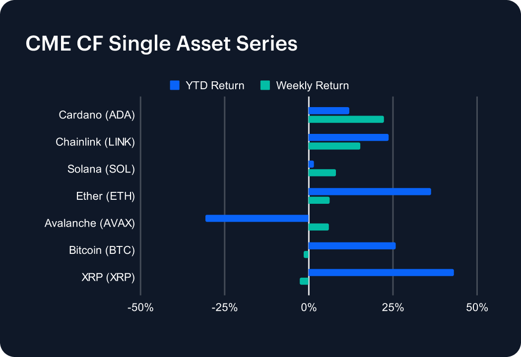 In another week of sharp moves, altcoins led the charge with outsized gains. Cardano stole the spotlight, soaring 22.26% to lift its year-to-date return into positive territory at 12.05%. Chainlink also impressed, adding 15.22% for a cumulative 23.81% gain in 2025. Solana climbed 8.00%, turning its performance marginally positive at 1.59% YTD, while Ether advanced 6.15%, cementing its leadership among majors with a robust 36.34% gain this year. Avalanche ticked higher by 6.03%, but remains the weakest link with a steep –30.84% drawdown YTD. On the downside, large-cap tokens lagged: Bitcoin slipped 1.45%, trimming its annual return to 25.93%, while XRP dropped 2.80%, though it still boasts a commanding 43.12% rally in 2025.