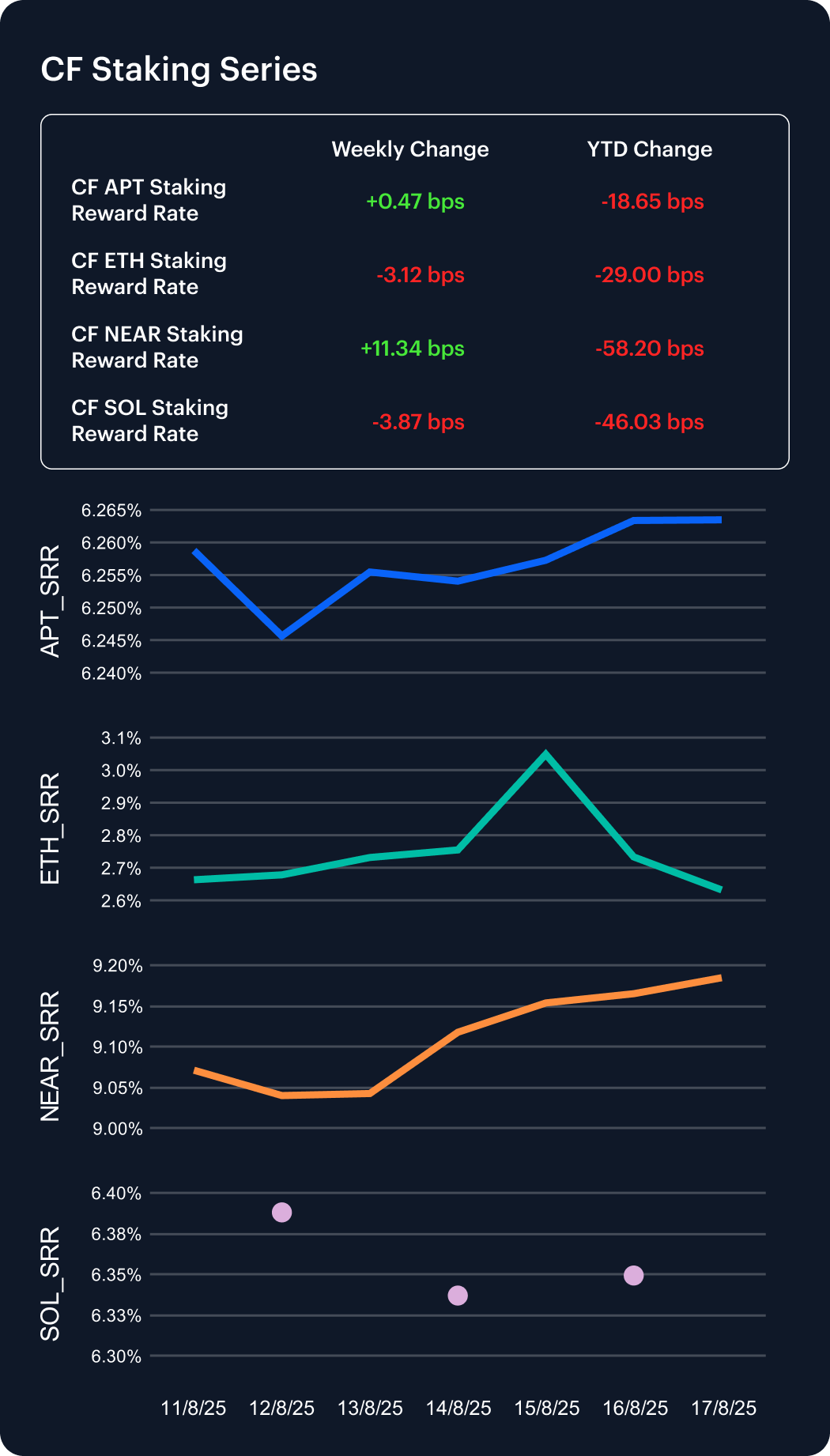 Staking rewards posted another mixed week as network dynamics and market flows drove dispersion. NEAR led the field, with its annualized reward rate climbing 11.34 bps to 9.18%, though it remains down 58 bps YTD. Aptos stayed the most stable, inching up 0.47 bps to 6.26%, leaving its year-to-date decline at just –18.65 bps (–2.89%). By contrast, Ethereum slipped 3.12 bps to 2.63%, extending its 2025 loss to –29 bps (–9.92%), the sharpest among majors. Solana eased 3.87 bps to 6.35%, with its annualized reward rate still off –46 bps YTD. These divergences highlight shifting validator economics, evolving inflation schedules, and varying levels of investor conviction across Proof-of-Stake ecosystems.