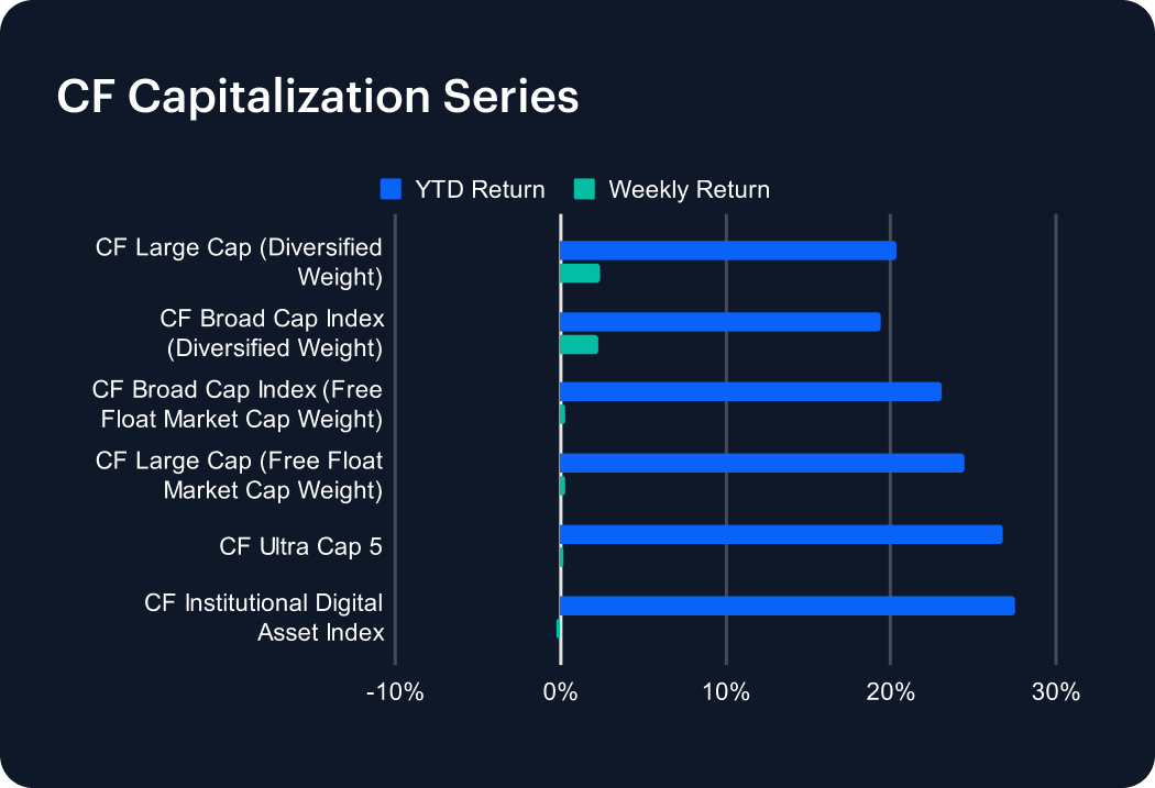 Last week saw momentum cool in the CF Capitalization Series, though the diversified-weighted indices still edged higher. The CF Large Cap (Diversified Weight) led with a 2.39% gain, lifting its year-to-date return to 20.35%, while the CF Broad Cap (Diversified Weight) added 2.27%, bringing its advance to 19.38%. Free-float benchmarks lagged, with the CF Broad Cap Index up just 0.30% (YTD 23.13%) and the CF Large Cap (Free Float) rising a muted 0.28% (YTD 24.49%). Among flagship gauges, the CF Ultra Cap 5 eked out 0.18%, extending its 2025 return to 26.76%, while the CF Institutional Digital Asset Index slipped 0.21%, though it still tops peers at 27.52% YTD. The week’s moves are consistent with leadership concentration and waning breadth in large-cap digital assets.