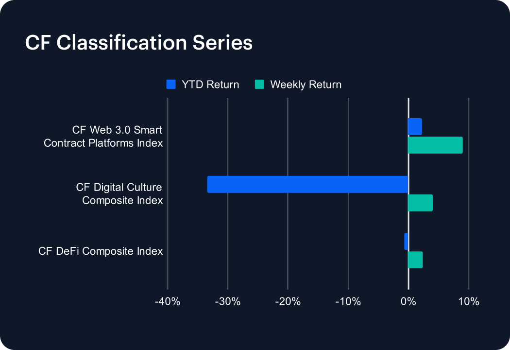 Last week delivered modest gains across the CF Classification Series, though far from the explosive rebounds seen earlier in the year. The CF Web 3.0 Smart Contract Platforms Index led with a 9.06% advance, pushing its 2025 return into positive territory at 2.26%. The CF Digital Culture Composite Index rose 4.00%, trimming losses but still deeply negative at –33.38% year to date. The CF DeFi Composite Index lagged with a 2.35% uptick, narrowing its deficit to just –0.74%. Despite the week’s improvement, these high-beta themes remain largely below prior peaks, highlighting uneven sentiment across digital asset verticals.