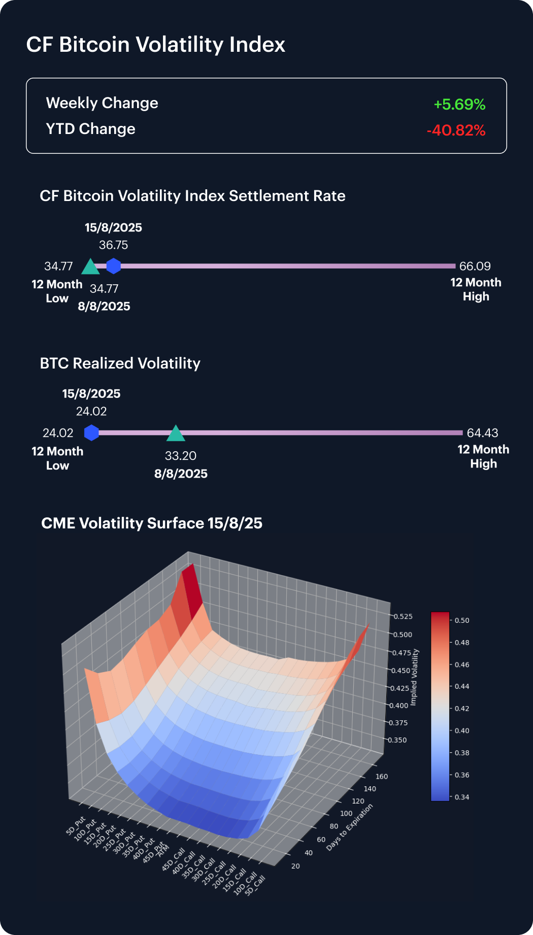 The CF Bitcoin Volatility Index Settlement Rate (BVXS) rose 5.69% last week, climbing from a 12-month low of 34.77 to 36.75, though it remains 40.82% below its January level. Realized volatility fell sharply to 24.02 from 33.20 a week earlier, highlighting a disconnect between calmer spot moves and rising implied metrics. On the surface, skew flipped negative, with short-dated put IV climbing and long-dated puts now exceeding calls—a notable inversion that underscores heightened downside hedging demand. Convexity across maturities has also steepened, leaving near-term options soft while longer expiries continue to price in greater tail risk. The evolving structure suggests traders are recalibrating for asymmetric downside even as headline volatility remains historically subdued.