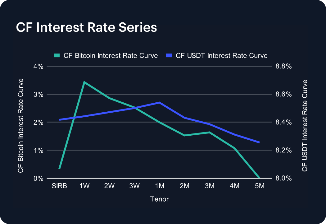 The CF USDT Interest Rate Curve held firmly elevated last week, with funding consistently above 8% across maturities. Rates peaked at 8.54% at one month before easing to 8.26% by five months, leaving the curve modestly downward-sloping. Since this benchmark is constructed by applying USDT-USD funding spreads (derived from DeFi lending markets such as Aave and Compound) onto the U.S. dollar curve, the persistence of such high levels underscores structural borrowing demand for USDT liquidity rather than short-term volatility. The slight front-end premium suggests traders are willing to pay up for immediate stablecoin access, while the gentle softening further out implies markets expect conditions to normalize. Compared with the flatlining BTC funding curve, USDT dynamics highlight the differentiated role of stablecoins as leverage collateral.