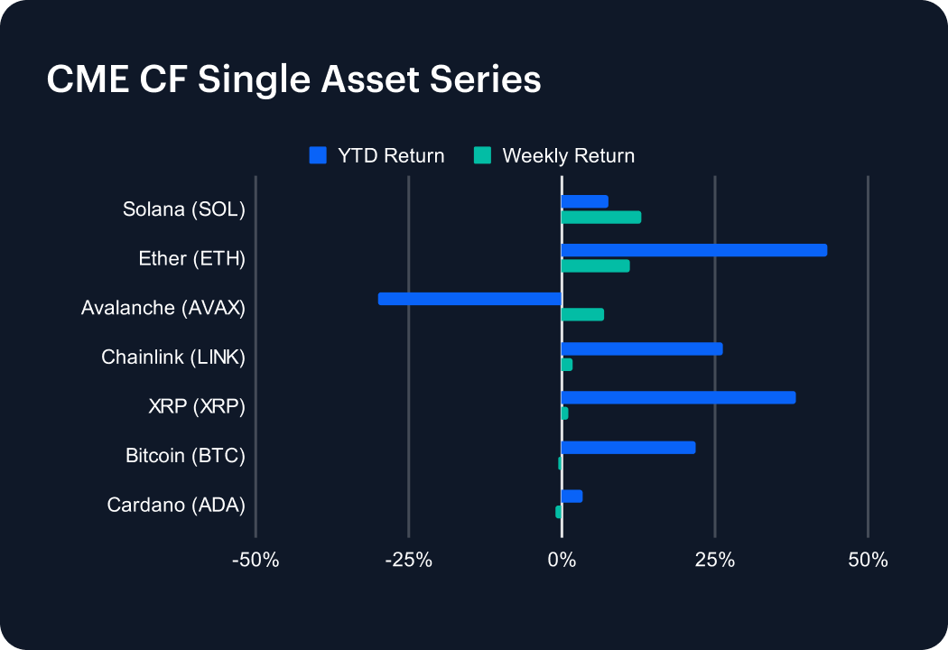 In another volatile week, altcoins again drove momentum with uneven but notable gains. Solana led the pack, surging 12.93% to push its year-to-date advance to 7.69%, while Ether followed closely, rallying 11.02% and extending its dominance with a robust 43.30% gain in 2025. Avalanche added 6.96%, though it remains deeply underwater at –30.11% YTD. Chainlink managed only a modest 1.65% rise but still sits on a 26.37% gain for the year. Among laggards, XRP ticked up 1.06%, easing back from its prior pace yet still strong at 38.25% YTD. Bitcoin slipped 0.70%, trimming its annual return to 21.80%, while Cardano dipped 1.04%, leaving it with just a 3.36% gain for 2025.