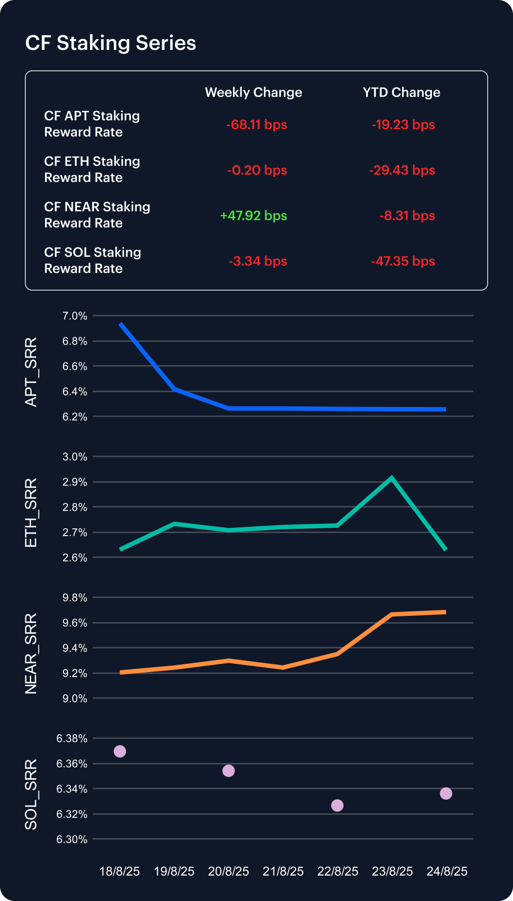 Staking rewards ended the week with familiar dispersion. NEAR once again led the field, its annualized reward rate jumping 47.92 bps to 9.68%, trimming its 2025 decline to just –8.31 bps (–0.85%). Aptos was the week’s notable laggard, sliding 68.11 bps to 6.26% and deepening its YTD erosion to –19.23 bps (–2.98%). Ethereum was comparatively stable, easing just 0.20 bps to 2.63%, though its cumulative 29.43 bps drawdown leaves it with the sharpest loss among majors YTD. Solana slipped 3.34 bps to 6.34%, maintaining a steeper –47.35 bps decline for 2025. The mix underscores how validator economics continue to diverge across Proof-of-Stake ecosystems.