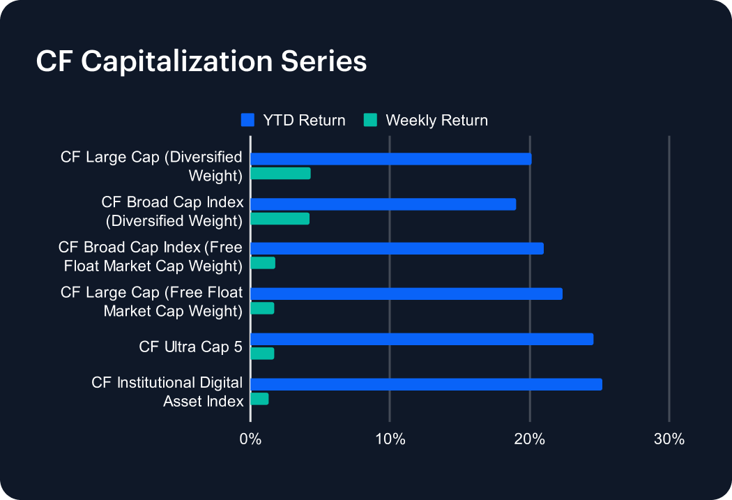 Momentum returned to the CF Capitalization Series last week, as diversified-weighted benchmarks outperformed. The CF Large Cap (Diversified Weight) led the charge, climbing 4.33% to lift its year-to-date return to 20.17%, while the CF Broad Cap (Diversified Weight) advanced 4.27%, extending its 2025 gain to 19.08%. Free-float measures lagged behind: the CF Broad Cap Index rose 1.78% (YTD 21.02%), while the CF Large Cap (Free Float) added 1.72%, pushing its annual return to 22.35%. Among flagship gauges, the CF Ultra Cap 5 gained 1.70%, building a 24.61% YTD advance. The CF Institutional Digital Asset Index posted a 1.30% rise, remaining the top performer year-to-date at 25.19%. The results highlight sustained concentration in large-cap layer-1 tokens.