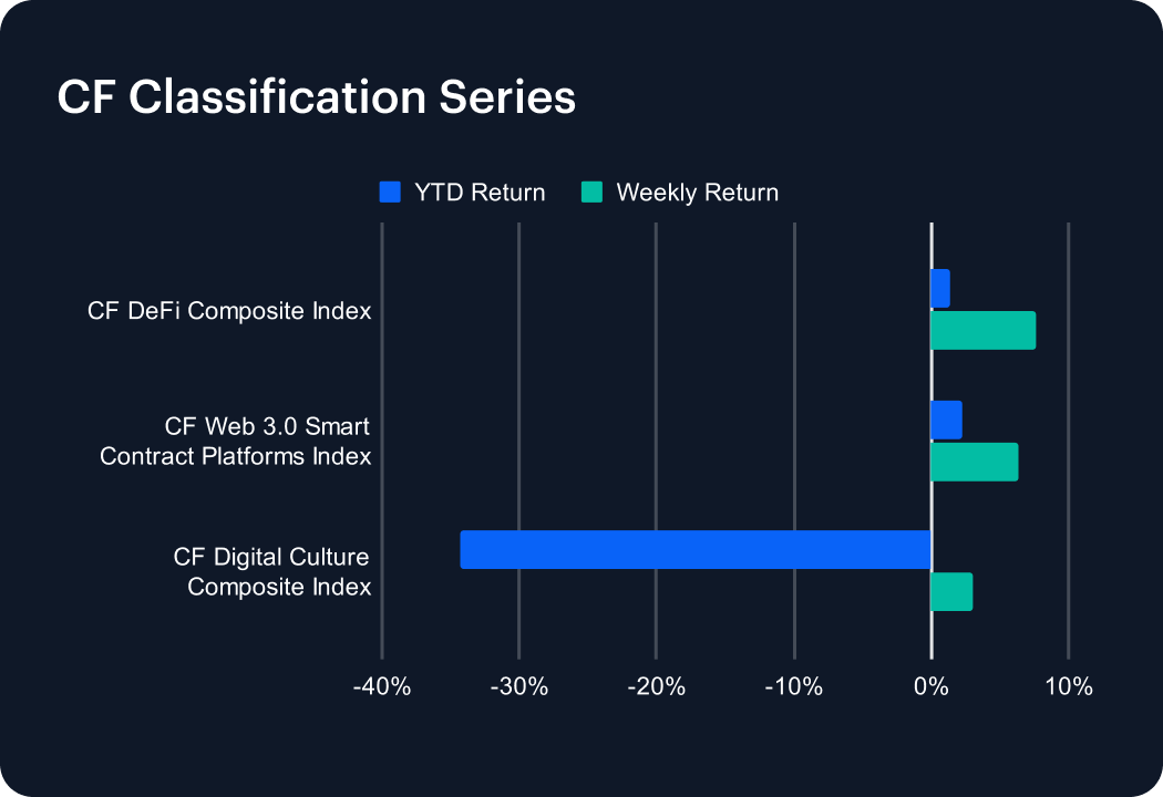 Last week brought firmer gains across the CF Classification Series, with risk-sensitive sectors showing renewed traction. The CF DeFi Composite Index led, rallying 7.67% to lift its year-to-date return into positive territory at 1.35%. The CF Web 3.0 Smart Contract Platforms Index followed with a 6.34% rise, extending its advance to 2.29% in 2025. Meanwhile, the CF Digital Culture Composite Index gained 3.03%, though it remains deeply underwater at –34.30% year to date. Despite the constructive moves, these high-beta themes continue to trade well below prior peaks, underscoring fragile conviction across digital asset verticals.