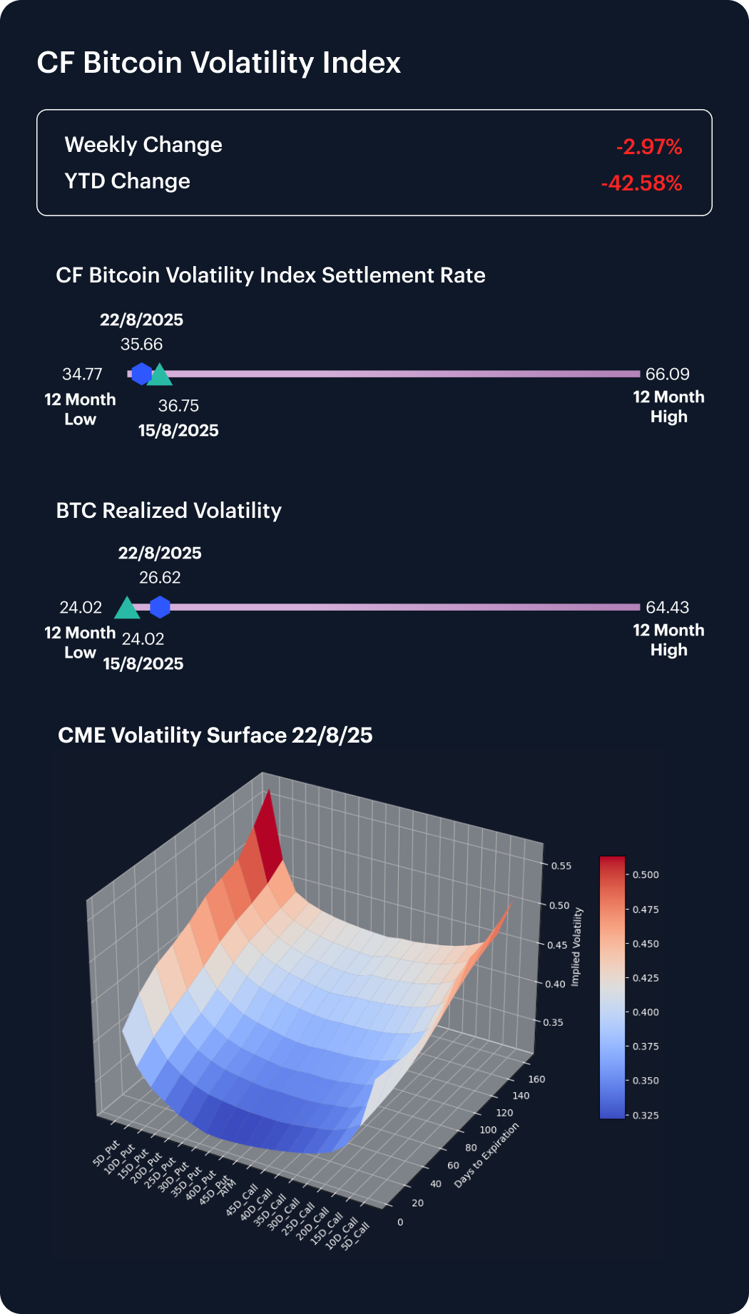 The CF Bitcoin Volatility Index Settlement Rate (BVXS) slipped 2.97% last week, easing from 36.75 to 35.66, and now sits 42.58% below its January level despite holding above its 12-month low of 34.77. Realized volatility ticked higher, rising to 26.62 from 24.02 a week earlier, underscoring a reversal in the prior divergence between implied and spot measures. Beneath the surface, skew moved more deeply into negative territory, with downside protection commanding a premium as traders increased put demand. Convexity across maturities remains elevated, leaving near-term options relatively soft while longer expiries continue to price in heavier tail risks. The structure highlights persistent caution, with markets recalibrating for asymmetric downside amid subdued realized volatility.