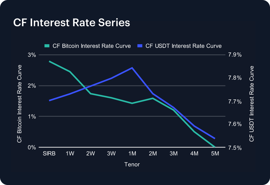 USDT funding stayed elevated, with the curve holding between 7.70% and 7.84% across the front end before easing to 7.54% at five months. Compared with last week’s 8%+ levels, rates have edged lower, though the structure remains modestly downward-sloping. The persistence of such high prints reflects continued structural demand for stablecoin liquidity, even as borrowing costs cool slightly. The front-end premium underscores appetite for immediate USDT access, while the gentle softening further out suggests expectations for normalization. By contrast, the Bitcoin funding curve slipped further, flattening near zero beyond four months, reinforcing the differentiated role of stablecoins as leverage collateral.