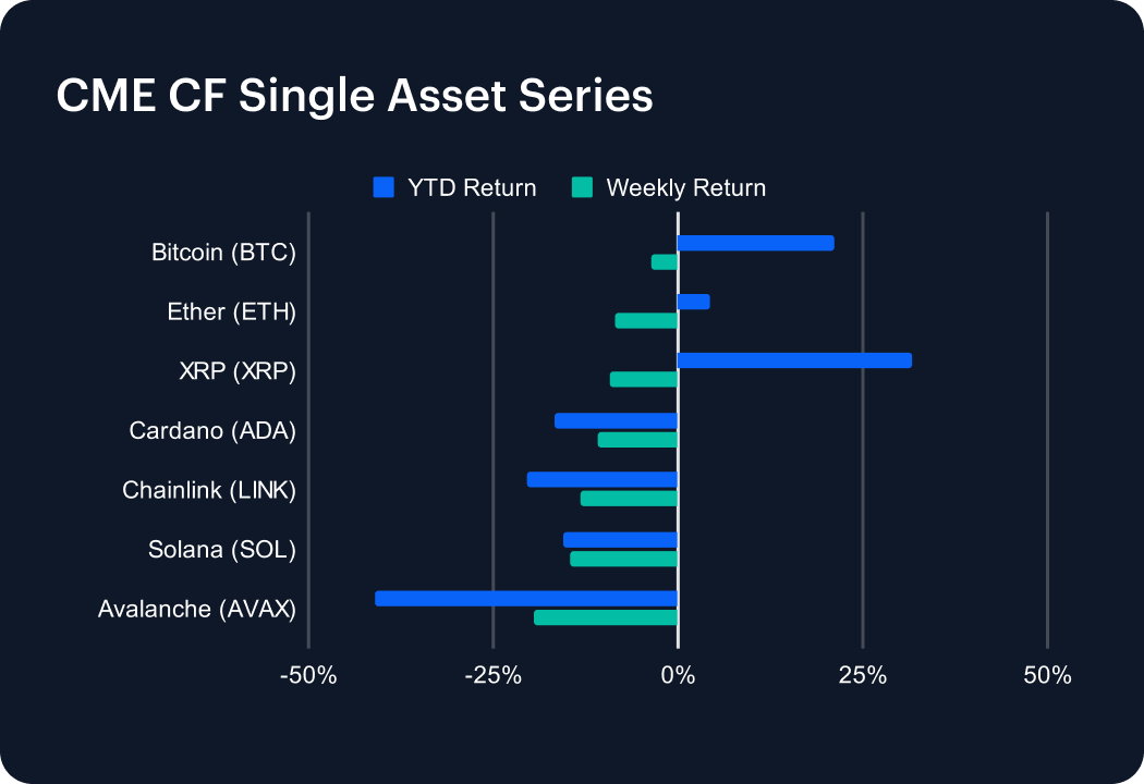 Digital assets advanced over the past week amid signs of caution. XRP rose 7.4%, outshining BTC's +5.8% and ETH's +5.5%. Volatility stabilized, with the BVXS implied vol. gauge +0.57 of a point and realized vol. +2.90. Key CF DACS averages rose, and CF BIRC funding rates were mostly steady.