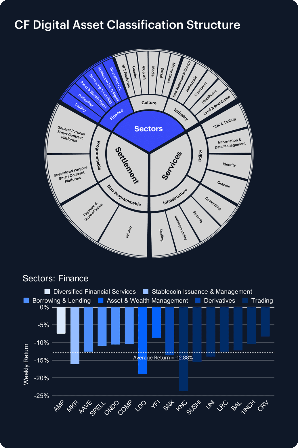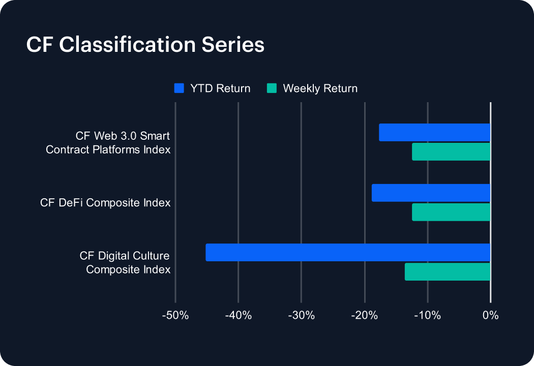 The CF Classification Series extended its downturn last week as every thematic index posted double-digit losses. The CF Web 3.0 Smart Contract Platforms Index led the pullback, plunging 12.46% and widening its year-to-date deficit to 17.71%. Close behind, the CF DeFi Composite Index slid 12.51%, deepening its YTD decline to 18.86%. The CF Digital Culture Composite Index suffered the steepest drop at 13.58%, pushing its cumulative loss to 45.23% in 2025. With high-beta segments bearing the brunt of volatility and no safe haven among themes, these benchmarks remain far below their early-January peaks and face a steep climb to recovery.
