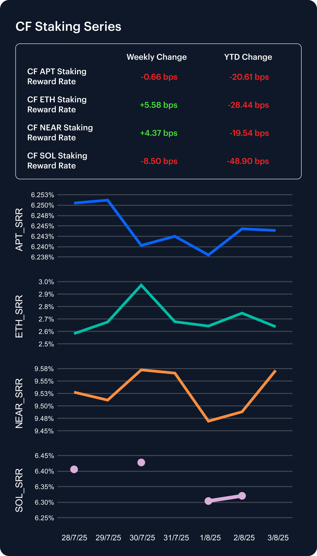 Staking yields continued to fluctuate last week, reflecting shifting demand across proof-of-stake ecosystems. Ether’s staking reward rate jumped 2.16% to 2.58%, yet it has fallen the most in 2025, with a year-to-date decline of 9.73%. NEAR climbed 0.46% to 9.53%, narrowing its YTD decrease to 2.00% and retaining its status as the highest-yielding network. Aptos dipped 0.11% to 6.25%, trimming its YTD decrease to 3.20%, while Solana slipped 1.33% to 6.41%, widening its year-to-date decrease to 7.18%. These shifts are the result of divergent staking appetites and inflation dynamics on these networks.