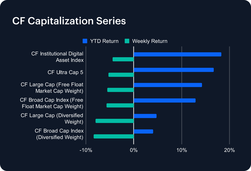 The CF Capitalization Series endured a pronounced pullback last week, with every marquee index posting declines. CF Institutional Digital Asset Index proved the most resilient, slipping just 4.45% and holding an 18.26% year-to-date gain. CF Ultra Cap 5 followed, down 5.25% (YTD +16.69%), while its broad-based free-float counterpart retraced 5.72%, trimming its YTD return to 12.92%. Among free-float large caps, the drop was 5.50%, leaving that segment up 14.29% in 2025. The diversified-weight indices underperformed: the Broad Cap fell 8.36% (YTD +4.07%) and Large Cap lost 8.02% (YTD +4.77%). This divergence underscores continued strength in large-cap names as the market experiences downside volatility.