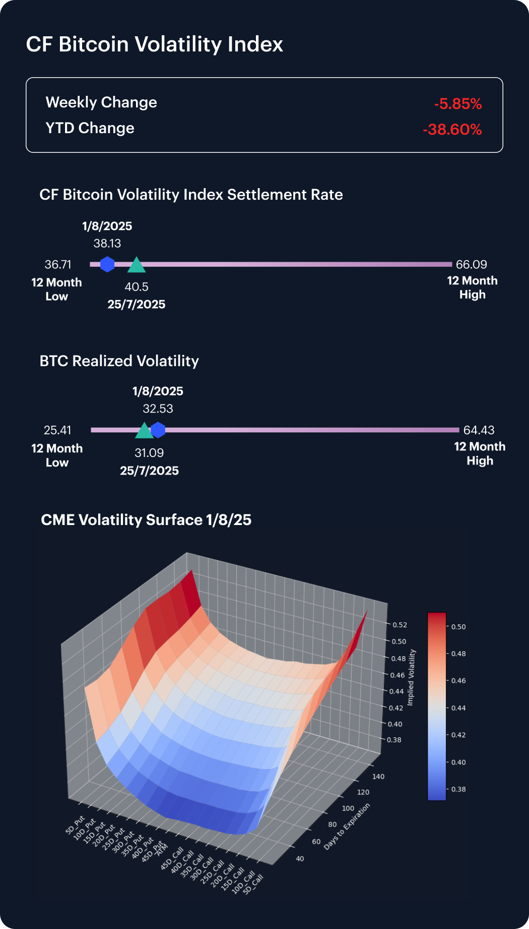 The CF Bitcoin Volatility Index Settlement Rate (BVXS) declined 5.85% last week, falling from 40.50 to 38.13 and remaining 38.60% below its January 1 level. Realized volatility rose to 32.53, up from 31.09 a week earlier, reflecting renewed spot swings even as option premia stay muted. On the volatility surface, skew remained positive but relatively flat across all delta buckets, indicating balanced demand for calls and puts. Notably, implied volatility for short-dated 5 delta puts ticked higher, suggesting growing tail-risk hedging in the front end. Short-dated tenors under 60 days continue to trade as the softest segment, whereas longer maturities command a material premium. Overall, softer BVXS prints alongside elevated front-end implied vols point to persistent directional exposure amid a calmer realized backdrop.