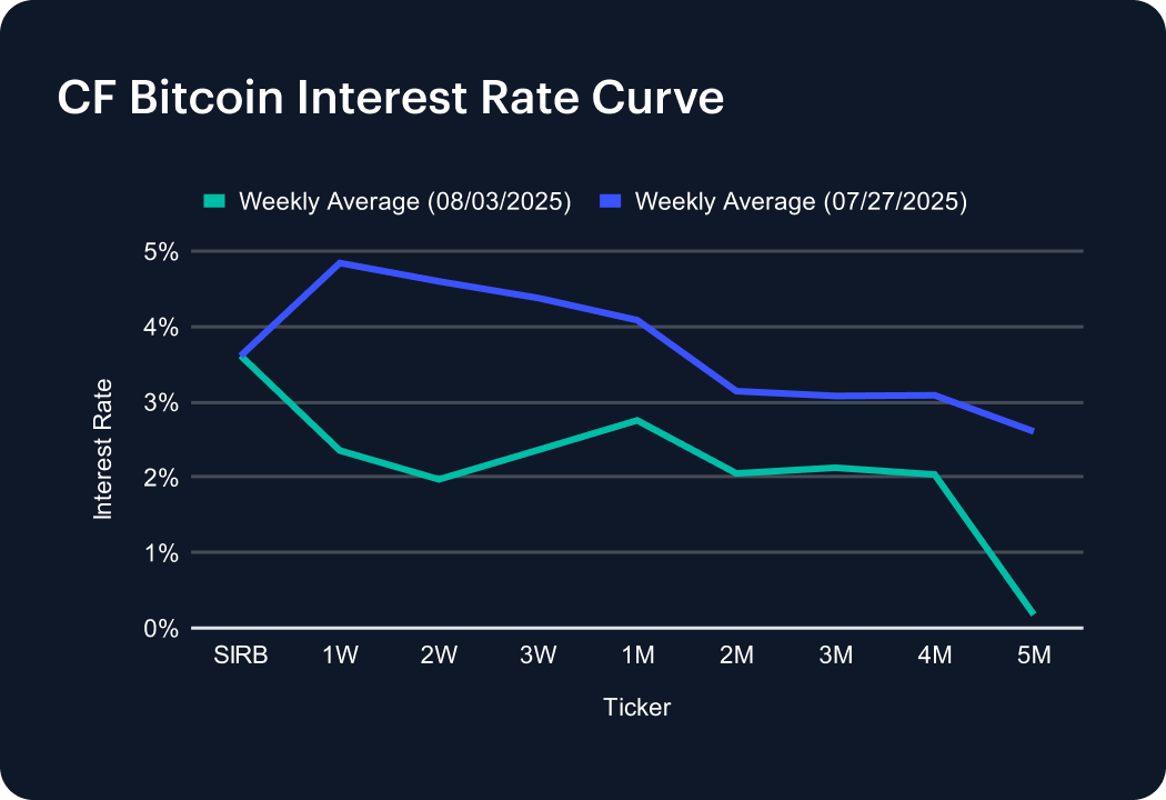 The CF Bitcoin Interest Rate Curve flattened significantly last week as funding costs across tenors collapsed. The Short-Term Interest Rate Benchmark held at 3.61%, anchoring the curve. One-week funding plunged 249 bps to 2.35%, while two- and three-week tenors fell 263 bps to 1.97% and 202 bps to 2.36%, respectively. One-month rates declined 133 bps to 2.75%. Mid-curve tenors also saw sharp drops: two-month down 109 bps to 2.05%, three-month off 95 bps to 2.13%, and four-month lower by 105 bps to 2.04%. Even five-month funding collapsed 243 bps to 0.18%. These widespread decreases reflect waning short-term demand and a pronounced curve flattening across the funding spectrum.