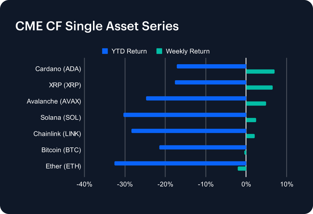 Digital asset markets steadied week-on-week (w/w) after the prior week’s drawdown, with performance rotating toward higher-beta assets. Among the large- and mega-cap coins populating our CME CF Single Asset Series, Cardano gained 7.0% and XRP rose 6.6%, while Avalanche added 4.9% and Solana advanced 2.5%. Bitcoin was essentially unchanged, down just 0.4%, and Ether softened by 2.1%. The shift in leadership is clearer in context: the prior week saw broad declines, with Bitcoin down 9.4% and Ether down 10.5%. This week’s dispersion indicates selective risk appetite rather than a uniform market-wide re-rating, with altcoin strength offset by softness in the largest two assets. Year-to-date (YTD), the single-asset basket remains negative across the series, reinforcing that the recovery has been partial and largely concentrated in the week’s strongest performers.