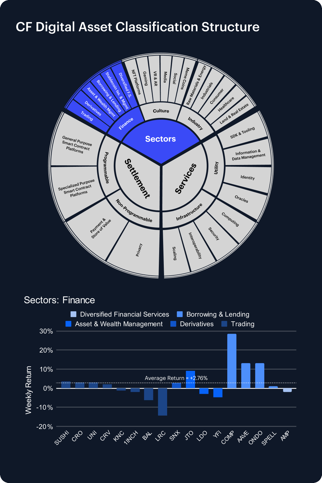 CF Digital Asset Classification Structure (CF DACS) sub-categories staged a broad rebound w/w, with all reported categories posting positive average returns after last week’s synchronized decline. The Infrastructure Sub-Category of Services led at +8.4% on average, followed by the Culture Sub-Category at +6.5%. Non-Programmable advanced 4.8% on average, while the Utility Sub-Category gained 4.2%. Meanwhile, Finance added 2.8% overall. The magnitude of the overall reversal is notable: in the prior week, tiers across our CF DACS taxonomy fell between 8.4% and 11.9%, implying double-digit percentage-point swings in several pockets of the market. The breadth of gains hints at a return of risk appetite across both infrastructure and application themes, with the strongest momentum concentrated in categories that typically exhibit higher beta to sentiment shifts.