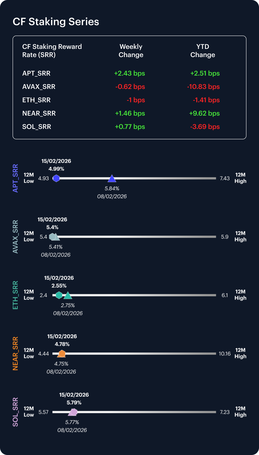 Within the CF Staking Series, performance was mixed w/w and generally more muted than last week’s moves. APT returned 0.49% w/w as its reward rate edged up 2.43 bps. NEAR returned 0.31% as its reward rate rose 1.46 bps. SOL returned 0.13% as its reward rate rose 0.77 bps. On the downside, AVAX returned -0.11% in step with its reward rate falling 0.62 bps, while ETH Staking printed a -0.39% return equating to a 1.00 bp reward rate fall. Overall, staking spot returns clustered close to flat and tracked only modest intra-week reward-rate moves, reinforcing a comparatively stable income backdrop versus the larger swings seen in broader risk assets.
