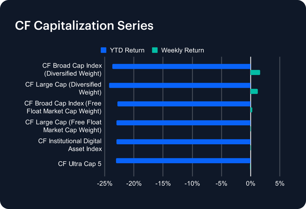 CF Capitalization series returned to positive territory w/w, with diversified-weight indices leading. The Broad Cap (Diversified Weight) gained 1.7% and the Large Cap (Diversified Weight) rose 1.2%. Free-float market-cap-weighted counterparts were closer to flat: Broad Cap (Free Float) increased 0.3% and Large Cap (Free Float) rose 0.1%. The Institutional Digital Asset Index also edged up approximately 0.1%. The Ultra Cap 5 was fractionally lower at -0.1%. The pattern contrasts with the prior week’s near-uniform declines of roughly 9.9% to 10.8% across the capitalization suite. Outperformance in the diversified-weight indices is a moderate indication that the week’s recovery was broader-based below the largest constituents, even as the ultra-cap segment lagged.