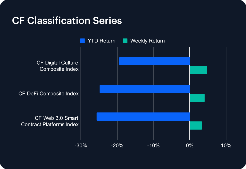 The CF Classifications series also turned higher w/w, with the Digital Culture Composite Index up 4.8%, the DeFi Composite Index up 4.2%, and the Web 3.0 Smart Contract Platforms Index up 3.4%. These moves follow a sharp prior-week pullback, when each classification declined by roughly 11% to 12.6%. In this context, the latest gains are suggestive of a stabilization phase rather than a full retracement of the earlier sell-off. Leadership from Digital Culture and DeFi suggests renewed appetite for application-layer and financial-primitive exposures, while the positive performance in smart contract platforms points to improving sentiment toward the core infrastructure stack.