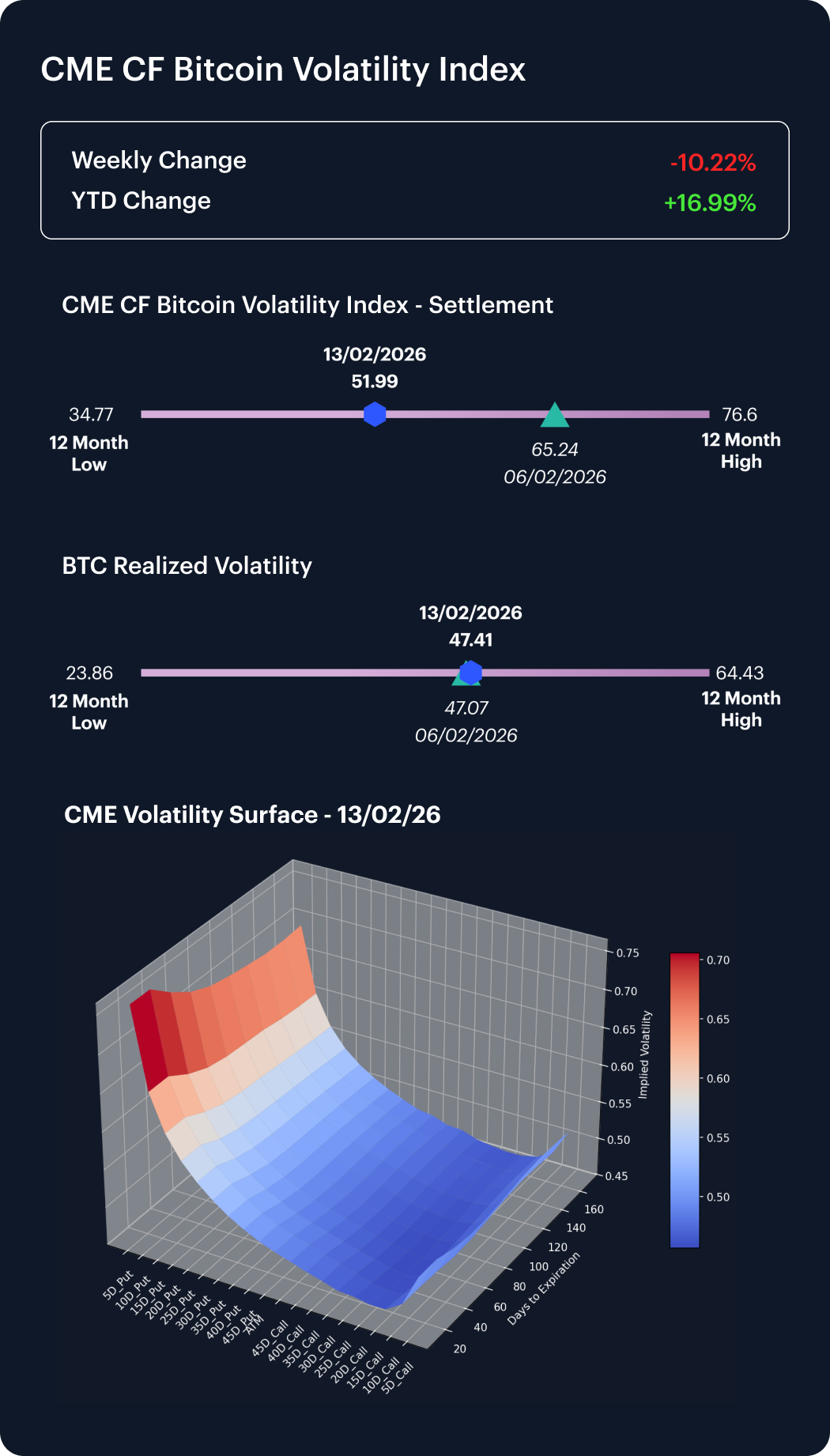 Implied Bitcoin volatility retraced meaningfully over the week, aligning with the broader stabilization in spot performance. Our CME CF Bitcoin Volatility Index (BVXS) fell to 51.99 as of Friday 13th, down 20.31% versus the prior Friday’s 65.24. The magnitude of the decline indicates a rapid unwind of the previous week’s volatility premium, consistent with improved near-term risk pricing, even as leadership rotated toward higher-beta assets.