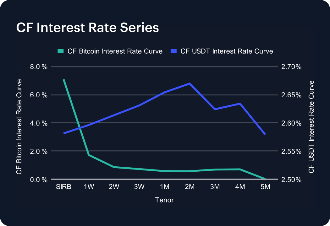 Front-end funding conditions eased sharply on the CF Bitcoin Interest Rate Curve w/w, while USDT funding firmed. The SIRB point fell from 22.94% to 7.10%, a move of 1,584 bps, and the 1W tenor declined from 3.31% to 1.72%, down 159 bps. Further out the curve, the 1M rate moved from 1.32% to 0.57% (down 75 bps) and the 3M rate eased from 1.07% to 0.68% (down 39 bps). By contrast, USDT rates rose across the same tenors: SIRB increased from 2.25% to 2.58% (up 33 bps) and 1W moved from 2.26% to 2.60% (up 34 bps). The net effect was a meaningful compression in the BTC front end alongside a modest upward shift in stablecoin funding costs.