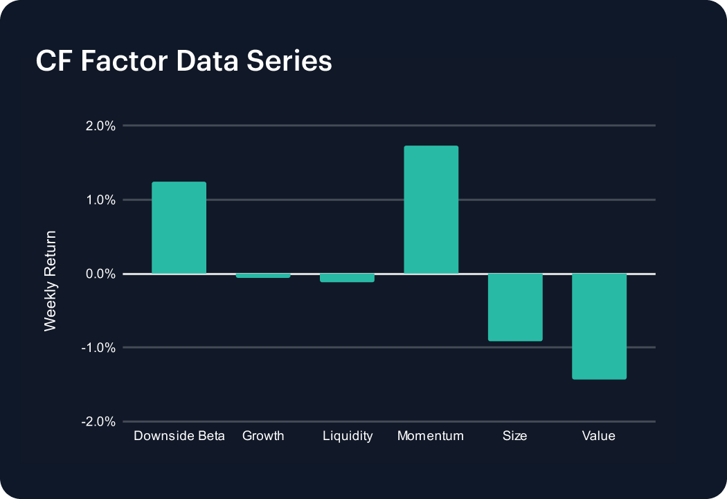 Factor leadership remained uneven over the week, with momentum again positive and value continuing to detract. Momentum delivered a cumulative 1.74% across the week’s daily series, while Downside Beta added 1.24%. Growth was close to flat at -0.06% and Liquidity slipped -0.11%. In contrast, Size fell -0.92% and Value declined -1.42%. The continued negative contribution from Value and Size is consistent with a preference for higher-beta segments of the market.