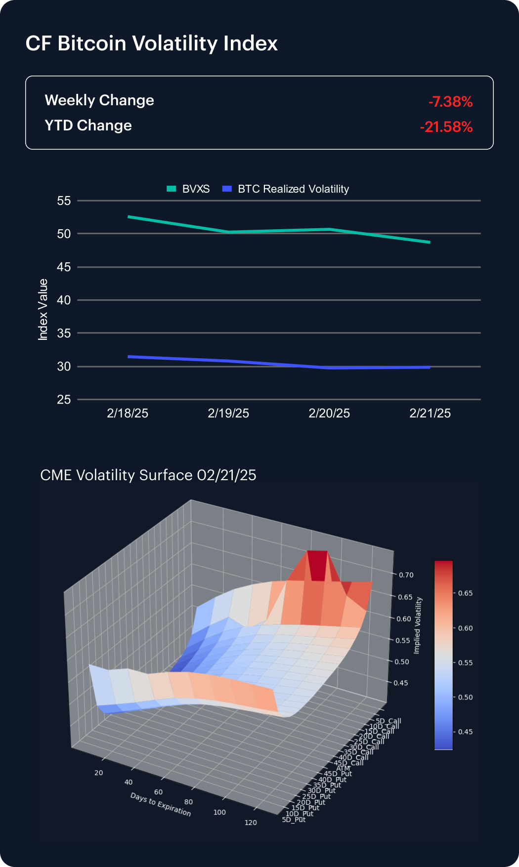 The CF Bitcoin Volatility Index Settlement Rate (BVXS) continued its downward trend this past week, declining -7.38% to settle at 48.70, deepening its YTD decline to -21.58%. Realized volatility also trended lower, starting the week at 31.46 and ending at 29.86, signaling a continued reduction in short-term price fluctuations.