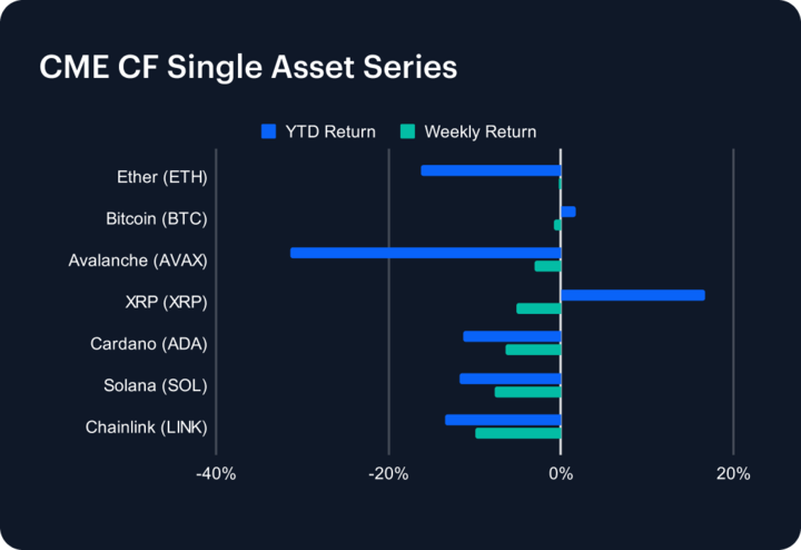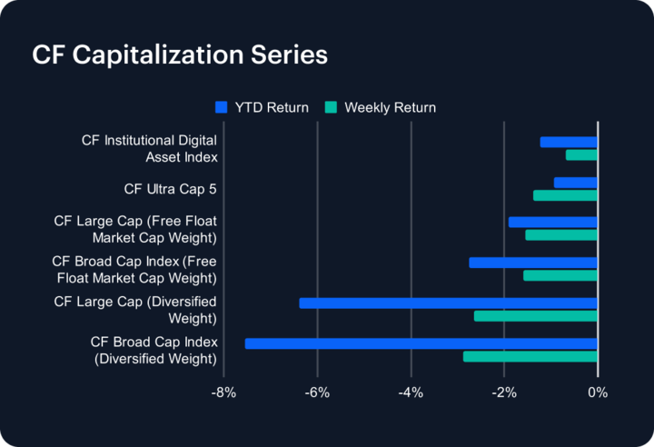Our CF Capitalization Series saw broad-based declines this past week, with free-float market cap-weighted indices faring slightly better than their diversified-weighted counterparts. The CF Broad Cap Index (Diversified Weight) led the downturn, dropping -2.89% for the week, deepening its YTD loss to -7.54%. The CF Large Cap Index (Diversified Weight) followed closely, declining -2.66% and extending its YTD decline to -6.38%. Meanwhile, free-float market cap-weighted indices also struggled, with the CF Broad Cap Index and CF Large Cap Index down -1.59% and -1.55%, respectively. The CF Ultra Cap 5 fell -1.39%, while the CF Institutional Digital Asset Index posted the smallest loss at -0.69%. Market sentiment remains fragile, with large-cap assets exhibiting relative resilience amid broad corrections.