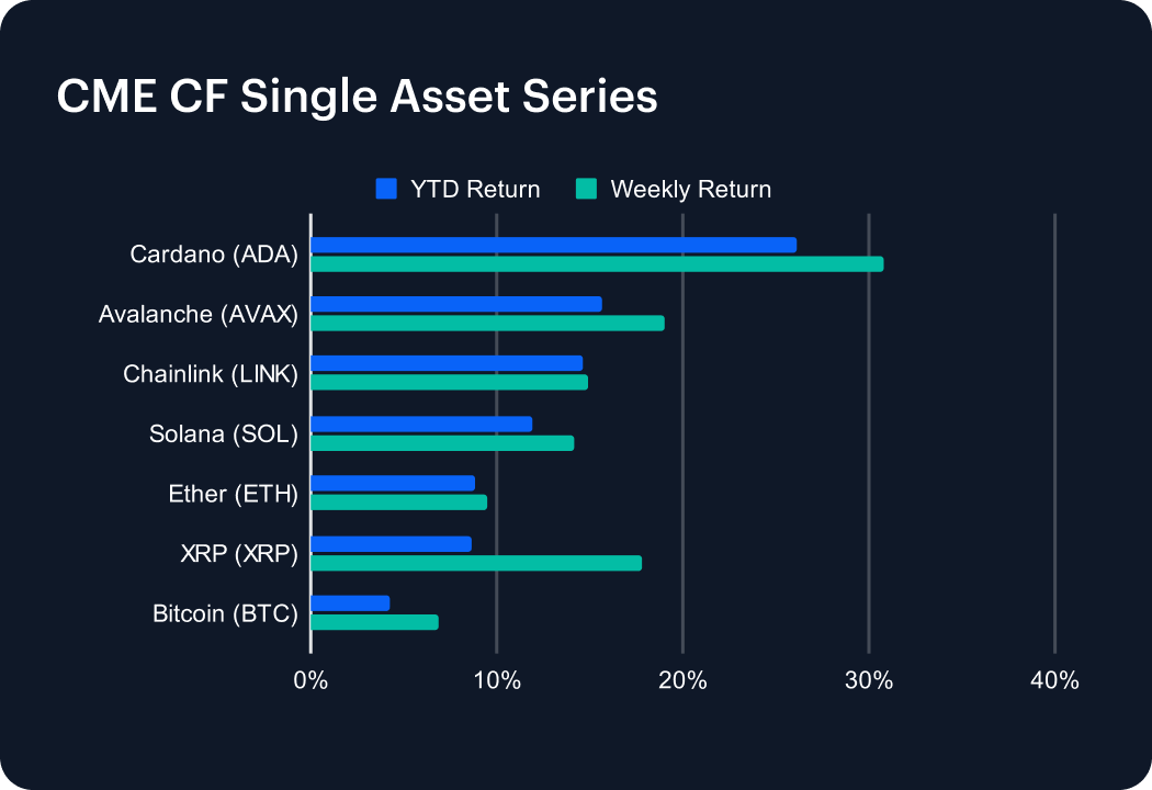 A broad-based rally across digital assets marked the first trading days of 2025, with all CME CF Single Asset indices advancing significantly. Cardano (ADA) emerged as the standout performer, surging +30.82% weekly and leading year-to-date (YTD) returns at +26.13%. Avalanche (AVAX) and Chainlink (LINK) demonstrated robust momentum, posting weekly gains of +19.02% and +14.92% respectively, translating to YTD returns of +15.66% and +14.63%. XRP outpaced market bellwether Bitcoin, advancing +17.81% for the week while BTC recorded a more modest +6.87% gain. The current market structure positions Solana (SOL) in fourth place YTD at +11.95%, followed by Ether (ETH) at +8.79%. Bitcoin, despite its recent appreciation, currently shows the most conservative YTD performance at +4.22%, suggesting a potential early rotation into altcoins.