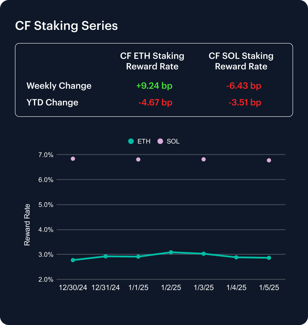 The CF SOL Staking Reward Rate Index (SOL_SRR) moved in the opposite direction, declining -6.43 basis points to settle at 6.77%. This represents a -0.94% weekly decline and positions the index down -3.51 basis points year-to-date. The divergent performance between ETH and SOL staking yields suggests evolving dynamics in the validator economics of major proof-of-stake networks as 2025 begins.