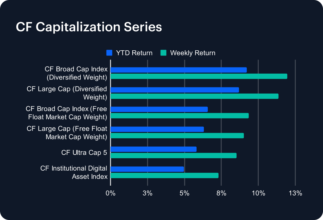 Our CF Capitalization indices showcased strong price appreciation to start the year, with diversified weightings significantly outperforming their free float counterparts. The CF Broad Cap Index (Diversified Weight) led the advance, posting an +11.97% weekly gain and securing the strongest year-to-date position at +9.20%. This outperformance indicates heightened risk appetite favoring mid-to-small capitalization assets.