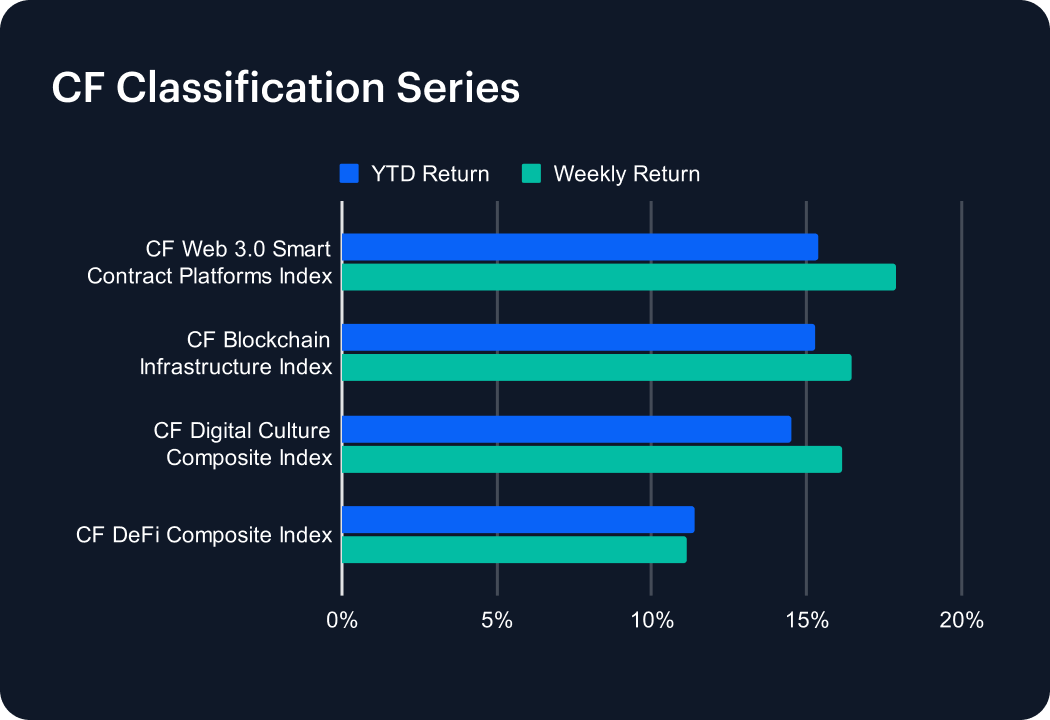 The CF Classification Series indices also demonstrated robust new-year momentum, with the CF Web 3.0 Smart Contract Platforms Index leading performance at +17.90% weekly and +15.38% year-to-date. Infrastructure protocols showed similar strength, with the CF Blockchain Infrastructure Index advancing +16.44% for the week, securing a +15.29% YTD position.