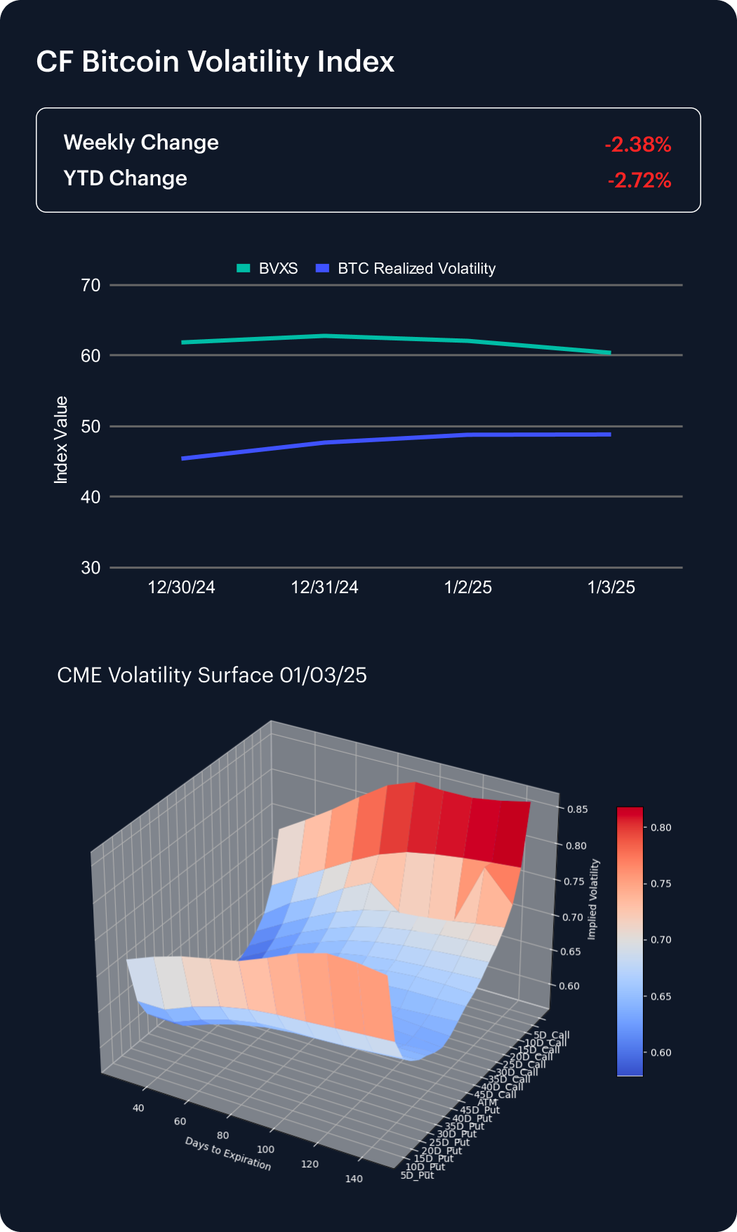 The CF Bitcoin Volatility Index Settlement Rate (BVXS) marked its second consecutive weekly decline, retreating -2.38% amid muted realized volatility conditions. Year-to-date, implied volatility metrics have compressed -2.72%, reflecting a moderation in implied options market risk premiums.