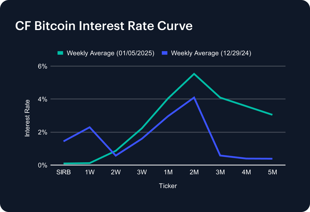 The CF Bitcoin Interest Rate Curve demonstrated significant repricing across all tenors, with particularly notable expansion in medium-term rates. The 2-Month tenor exhibited the strongest positioning at 5.53%, representing a +143 basis point weekly increase, while the 1-Month rate advanced +108 basis points to 4.04%.