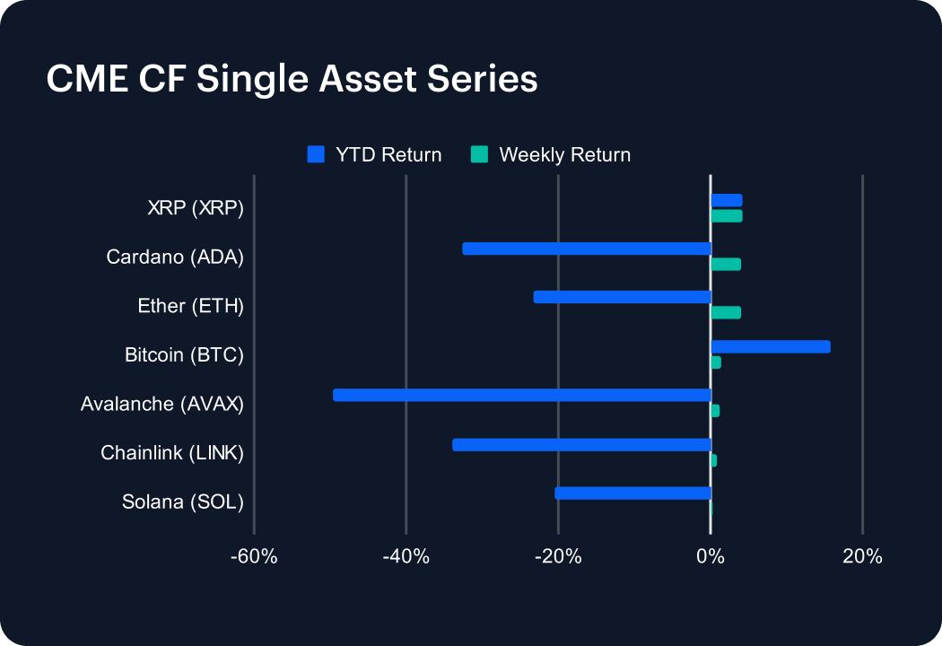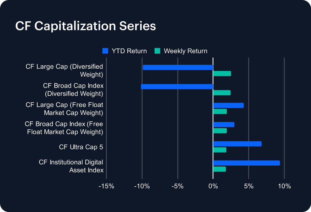 The CF Capitalization Series notched a second straight advance, though weekly gains cooled to roughly 2%. Diversified-weight benchmarks led: the CF Large Cap (Diversified) rose 2.51%, edging the CF Broad Cap (Diversified) at 2.44%, trimming their year-to-date deficits to –9.91% and –10.14%, respectively. Free-float gauges lagged slightly, yet both extended 2025 gains; the CF Large Cap (Free-Float) climbed 1.91% to +4.28% YTD, while the CF Broad Cap (Free-Float) added 1.90% to +3.01%. The CF Ultra Cap 5 gained 1.86%, lifting its YTD return to 6.81%. Still wearing the performance crown, the CF Institutional Digital Asset Index advanced 1.76% on the week and now stands 9.36% higher year-to-date.