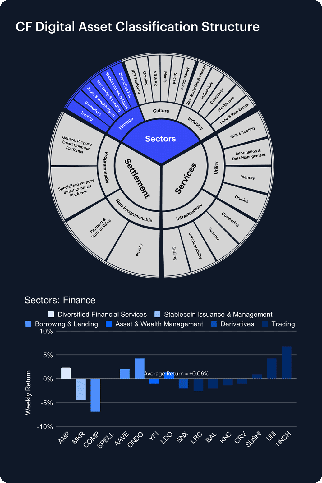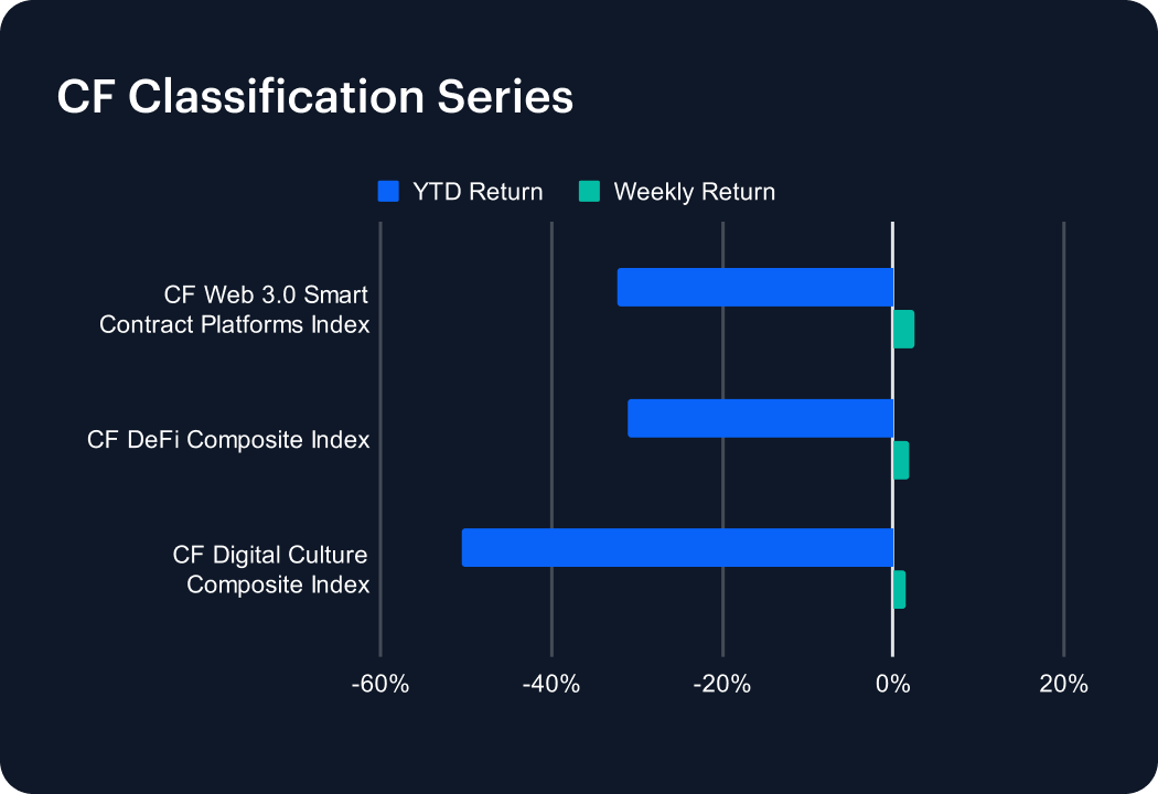 The CF Classification Series extended its recovery, as each thematic benchmark notched another weekly gain. The CF Web 3.0 Smart-Contract Platforms Index paced the trio, climbing 2.45% and shaving its 2025 loss to –32.19%. The CF DeFi Composite Index added 1.85%, narrowing its year-to-date decline to –31.01%, while the CF Digital Culture Composite Index advanced 1.48% but remains the laggard at –50.46% YTD. Although this second straight weekly rise hints that risk appetite is gradually rebuilding across high-beta corners of the market, the still-steep double-digit deficits highlight how much ground valuations must cover before reclaiming their early-January peaks.