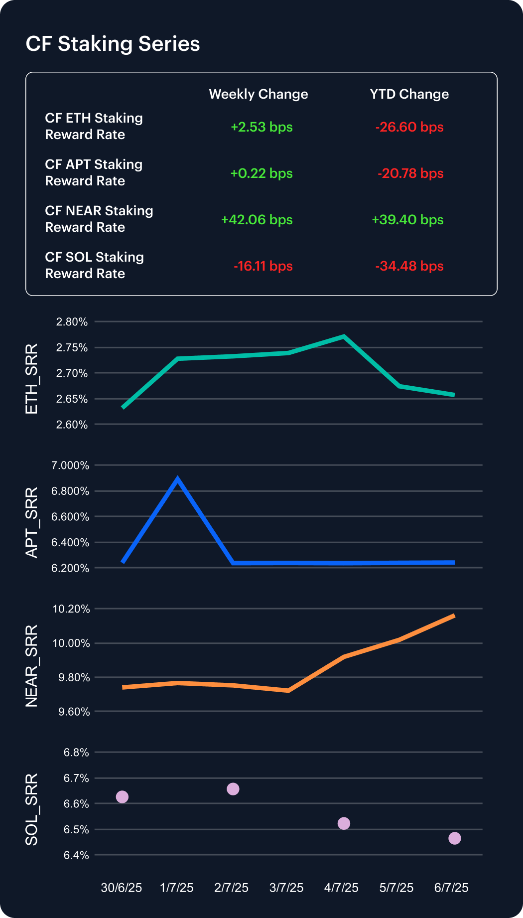 Staking yields diverged afresh last week, headlined by NEAR’s outsized surge. The CF NEAR Staking Reward Rate Index jumped 42 bps to 10.16%, lifting its year-to-date advance to 4.0%. Ether’s ETH_SRR inched 3 bps higher to 2.66%, shaving its 2025 decline to –9.1% yet still hovering near record lows. Aptos yields were virtually flat at 6.24%, leaving them 21 bps below New-Year levels. Solana was the sole laggard: SOL_SRR slid 16 bps to 6.46%, deepening its YTD drop to –5.1%. Varied on-chain activity and inflation dynamics continue to widen the reward gap across proof-of-stake networks.
