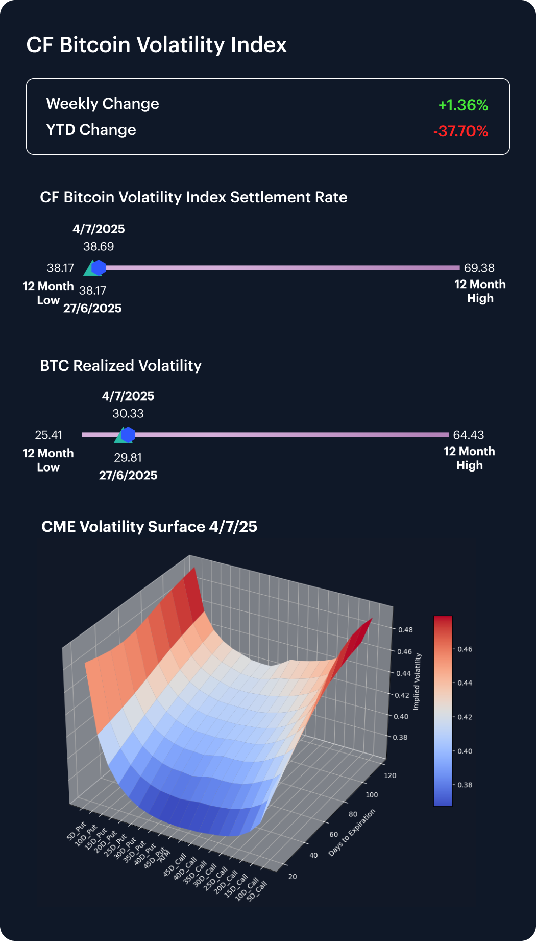 The CF Bitcoin Volatility Index Settlement Rate (BVXS) edged up to 38.69 last week, a 1.4% increase that keeps it roughly 38% below its 1-January mark and only a shade above June’s 12-month trough at 38.17. Realized volatility continued to increase, reaching 30.33 from 29.81 (+1.8%), reflecting livelier spot swings even as option premia stay muted. Aggregate skew across the 10-, 15- and 20-delta remains slightly negative, yet closer to zero than the prior week, and the 25-delta skew actually flipped positive to +0.23. Sub-60-day volatility remains the softest part of the surface, while longer tenors still command a premium. The blend of firmer realized prints, recovering skew and depressed front-end IV suggests traders are dialing back crash insurance and cautiously resuming directional risk.