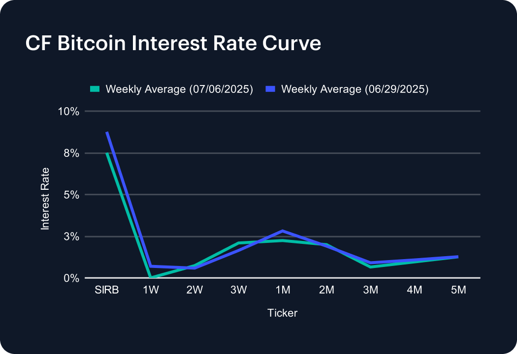 Short-term funding costs eased last week as the CF Bitcoin Interest Rate Curve shifted lower at most nodes, unwinding much of the prior spike. The Short-Term Interest Rate Benchmark (SIRB) fell 126 bps to 7.50%, reversing two-thirds of the earlier surge. The 1-week tenor plunged 70 bps to 0.00%, while 2- and 3-week points firmed 14 bps and 44 bps to 0.73% and 2.09%, carving a pronounced hump in the near curve. One-month rates retreated 57 bps to 2.24%, and tenors beyond two months slipped 1–26 bps, leaving the back end near 1.0 – 1.3%. The result is a flatter curve anchored by a sharply lower policy rate and scattered mid-curve premiums.