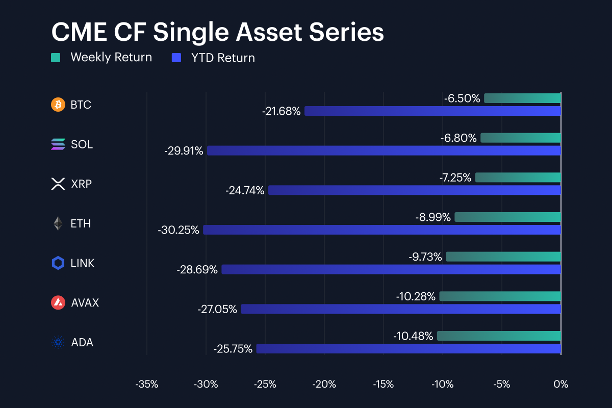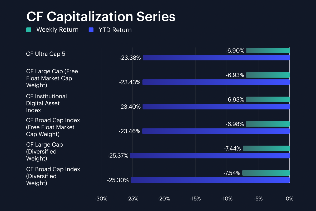 Market-cap indices moved in an unusually tight formation, reinforcing the idea that the week’s drawdown was broad and tier-agnostic; still, their performance was not entirely bereft of tell-tale signals. CF Ultra Cap 5 fell 6.9% w/w to stand at -23.4% YTD, while the CF Institutional Digital Asset Index and CF Large Cap Index (Free Float Market Cap Weight) both declined 6.9%, leaving their YTD returns also near-identical at approximately -23.4% a piece. The CF Broad Cap Index (Free Float Market Cap Weight) posted a decline slightly closer to -7.0%, while the diversified-weight CF Large Cap and CF Broad Cap versions fell 7.4% and 7.5%. Across the full capitalization set, weekly returns spanned only 0.64 percentage points, from approximately -6.9% to -7.5%. A spread that narrow reveals that outright market direction prevailed over index construction nuances, though diversified-weight variants did lag their free-float counterparts by roughly 0.51 percentage points for the CF Large Cap, and 0.56 percentage points for the CF Broad Cap. Could those gaps point to a mild mega-cap quality bid inside a negative week? The largest, most liquid exposures still fell materially, but broader and more evenly weighted baskets absorbed slightly more damage.