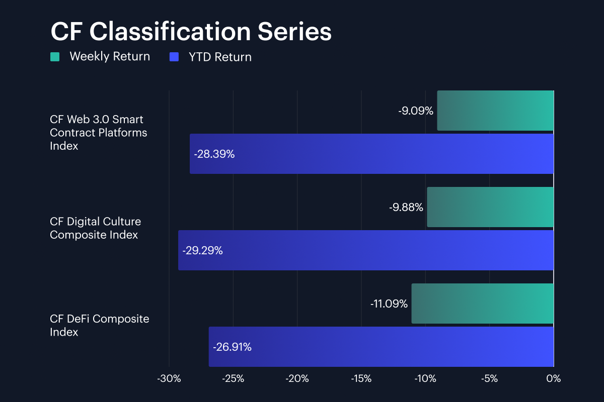 Across the CF Classification Series, all three thematic baskets declined, but the ranking was relatively tight. The CF Web 3.0 Smart Contract Platforms Index fell 9.1% w/w for a -28.4% YTD return, compared with the CF Digital Culture Composite Index at -9.9% week-on-week and -29.3% YTD, and the CF DeFi Composite Index at -11.1% w/w and -26.9% YTD. The spread between the best and worst weekly performers was therefore 2.0 percentage points, with Web 3.0 ahead of DeFi. That 2.0 percentage-point gap establishes notional leadership, but it’s still clear the instinct to head lower was stronger than any specific rotation between these themes. Also, DeFi’s weaker weekly print is worth noting, because it arrived against a still slightly better year-to-date position than for Web 3.0 and Culture, implying that the week’s selling pressure bit harder in one of the areas that had retained comparatively more value earlier in the year. In practice, the classification tape looked compressed on the downside: every basket fell between 9.1% and 11.1%. So, the market marked down protocol beta, cultural exposure and DeFi together, while only modestly rewarding relative defensiveness inside the theme complex.
