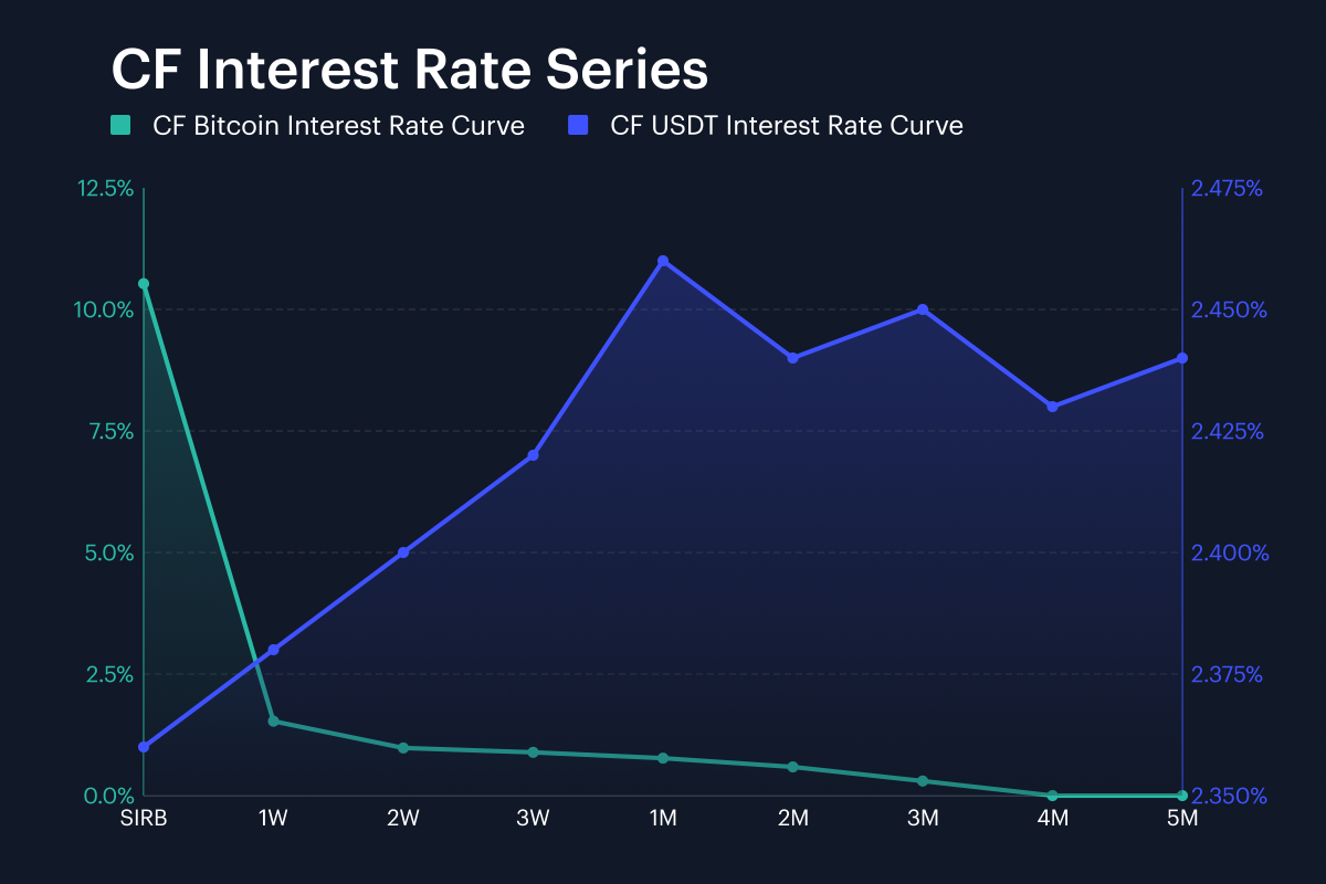 Funding conditions once again diverged across our CF BIRC curves, with Bitcoin’s exhibiting a front-end kink, and USDT’s repricing higher across almost the entire term structure. The Session Interest Rate for Bitcoin (SIRB) moved from 11.37% at the end of the prior week to 10.53% at the close of the most recent week, down 84.2 basis points. Inside the curve, however, BTC 1W rose from 0.55% to 1.53%, a 97.8 basis-point jump, while BTC 3M fell from 0.46% to 0.30%, down 15.3 basis points. That left the front-end gap between 1W and 3M at 1.23 percentage points, versus 0.09 percentage points a week earlier. In USDT funding, the session rate increased from 2.25% to 2.36%, up 10.8 basis points, and the 1W to 3M sector moved from 2.27% and 2.31%, to 2.38% and 2.45%, increases of 10.6 and 13.2 basis points. Across both curves, tenor-by-tenor changes ran from -84.2 basis points in SIRB, to 97.8 basis points in 1W. The result is a clear split between a kinked BTC funding curve, and a broadly higher USDT curve. This suggests short-dated Bitcoin funding stress side by side with firmer dollar stablecoin rates further out the curve.