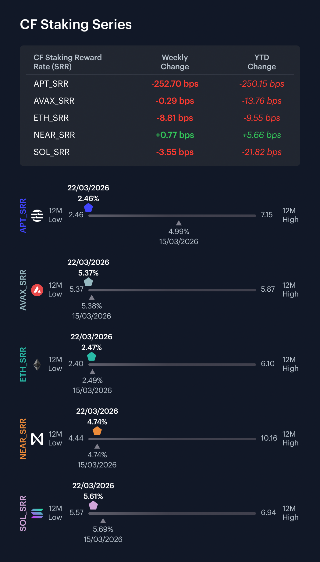 Within the CF Staking Series, APT Staking was the clear outlier, returning -50.7% week-on-week. Between March 16th and March 22nd, its reward rate moved from 4.9884% to 2.4614%, a drop of 252.7 basis points. AVAX Staking was effectively flat at -0.1% week-on-week. Its reward rate moved from 5.3778% to 5.3749%, a decline of 0.3 basis points. ETH Staking returned -3.4% week-on-week, with a reward rate move from 2.5611% to 2.4730%, a fall of 8.8 basis points. NEAR Staking gained 0.2% week-on-week, while SOL Staking fell 0.6% week-on-week. NEAR’s reward rate moved from 4.7307% to 4.7384%, up 0.8 basis points, and SOL’s moved from 5.6419% to 5.6064%, down 3.6 basis points. Excluding APT’s 252.7 basis-point step-down, the rest of the complex sat in a much narrower band from -8.8 basis points to +0.8 basis points. All told, largely stable staking conditions outside a single protocol-specific repricing.