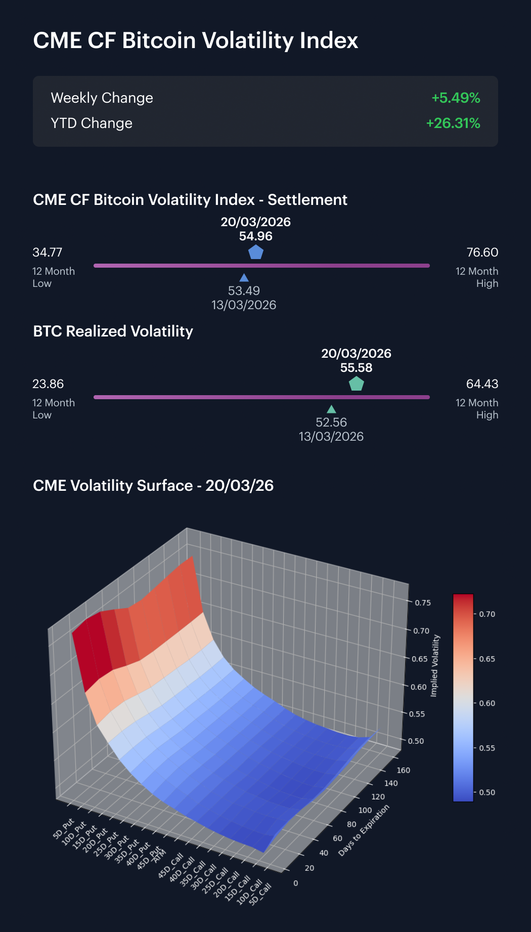 Bitcoin volatility rose in both implied and realized terms over the latest business-week snapshot, with realized moving fastest. The CME CF Bitcoin Volatility – Settlement (BVXS) went from 53.49 one week earlier to 54.96 by Friday, March 20th, a 1.47 vol.-point increase, while realized volatility rose from 52.56 to 55.58, up 3.02 vol. points. That left realized 0.62 points above implied, after implied had been 0.93 points above realized a week before. As such, the implied-realized spread flipped, swinging by 1.55 vol. points from a positive premium to a small realized-to-implied configuration. The move was sufficient enough to dispel notions of complacency. Note that both BVXS and realized landed near 55, with spot turbulence accelerating faster than options repricing, and realized catching up with and even slightly overtaking implied, despite hedging demand remaining elevated. That’s more consistent with an active spot repricing than with options alone flashing warning signals.