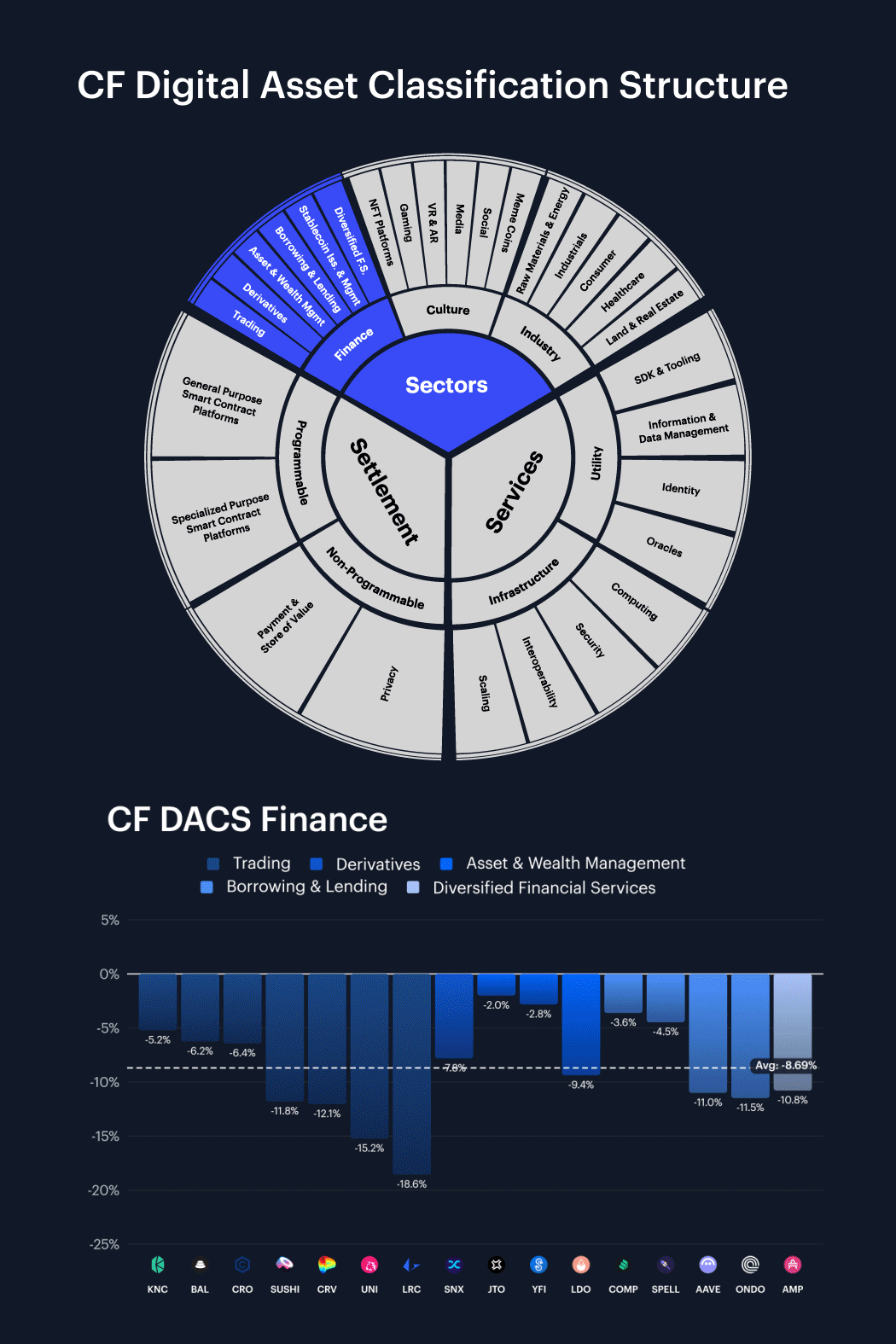 Sector performance remained negative across the CF Digital Asset Classification Structure (CF DACS), but its tiers revealed a larger dispersion than was apparent in the single-asset table. Utility was the best-performing Sub-Category at -1.9% on average w/w, helped by ANKR’s 23.0% gain and BICO’s 0.9% decline, while Culture lagged with an average -10.3%, with PRIME down 18.8% and PEPE down 16.4%. Finance averaged -8.7%, Infrastructure -8.6%, Programmable -8.6% and Non-Programmable -6.2%, leaving a spread of about 8.4 percentage points between the best and worst major Sub-Categories. Within that, the gap between Utility’s ANKR at +23.0% and Culture’s PRIME at -18.8% produced a constituent range of 41.8 percentage points, underscoring that idiosyncratic dispersion remained available even inside an otherwise weak tape. Nevertheless, the location of the averages matters more than the outliers: five of the six Sub-Categories printed between -6.2% and -10.3%, which points to a generalized retreat from higher-beta thematic exposure, while Utility’s shallower -1.9% print suggests investors were more selective where token utility and infrastructure-linked narratives were clearer.