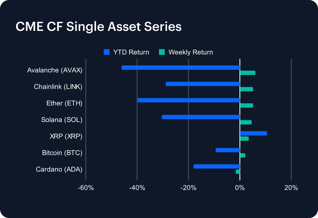 The digital asset market rebounded modestly this week, with most major cryptocurrencies posting gains after recent declines. Avalanche (AVAX) led the recovery, rising 6.04% weekly, though it remains down -46.00% year-to-date (YTD). Chainlink (LINK) added 5.17%, trimming its YTD loss to -28.90%, while Ether (ETH) gained 5.05% but is still down -39.83% YTD. Solana (SOL) advanced 4.53%, bringing its YTD return to -30.39%. XRP continued its positive momentum, up 3.38% on the week and now showing a solid YTD gain of 10.52%. Bitcoin (BTC) edged higher by 2.13%, narrowing its YTD decline to -9.45%. Cardano (ADA) was the sole laggard, slipping -1.66% and extending its YTD drop to -18.11%. Market sentiment remains cautiously optimistic amid shifting macroeconomic signals.