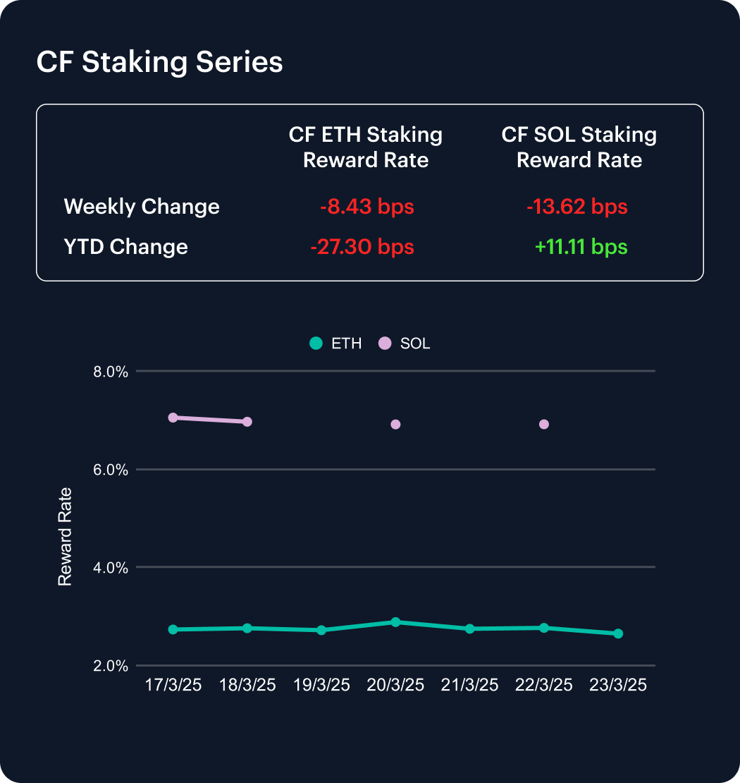 Meanwhile, the CF SOL Staking Reward Rate Index (SOL_SRR) slipped 13.62 bps to 6.92%, posting a -1.93% weekly decline. Despite this pullback, SOL_SRR remains up 11.11 bps for the year, a 1.63% YTD gain. These trends underscore Ethereum’s persistent reward compression, while Solana continues to demonstrate relative resilience in long-term staking yield performance.